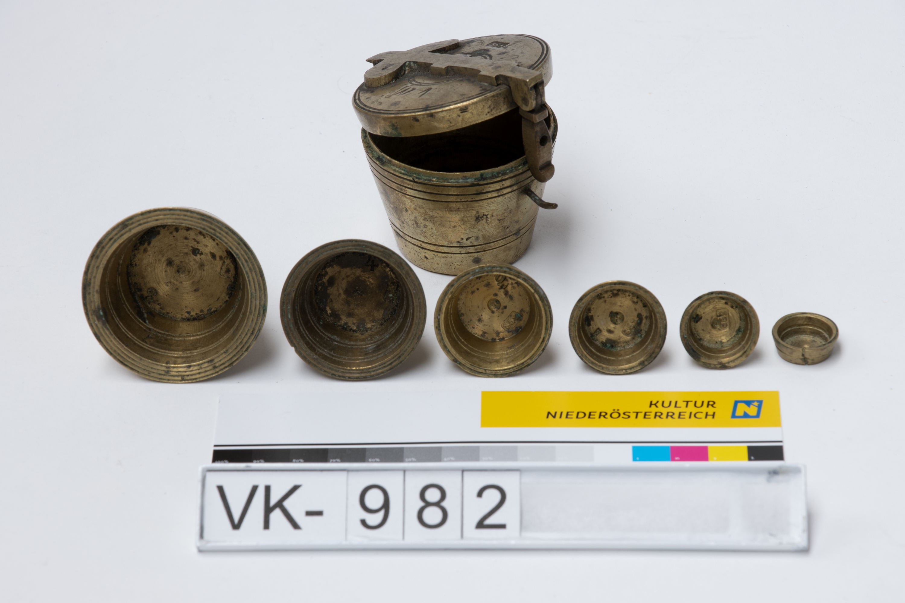 Ein Satz Bechergewichte aus Messing mit einem Aufbewahrungsgewicht mit Klappdeckel (VK-982a) und sechs ineinander gestapelten kleineren Gewichten (VK-982b bis VK-982g, von groß nach klein). Die Gewichte sind mit unterschiedlichen Punzierungen (Zahlen, Buchstaben) versehen.