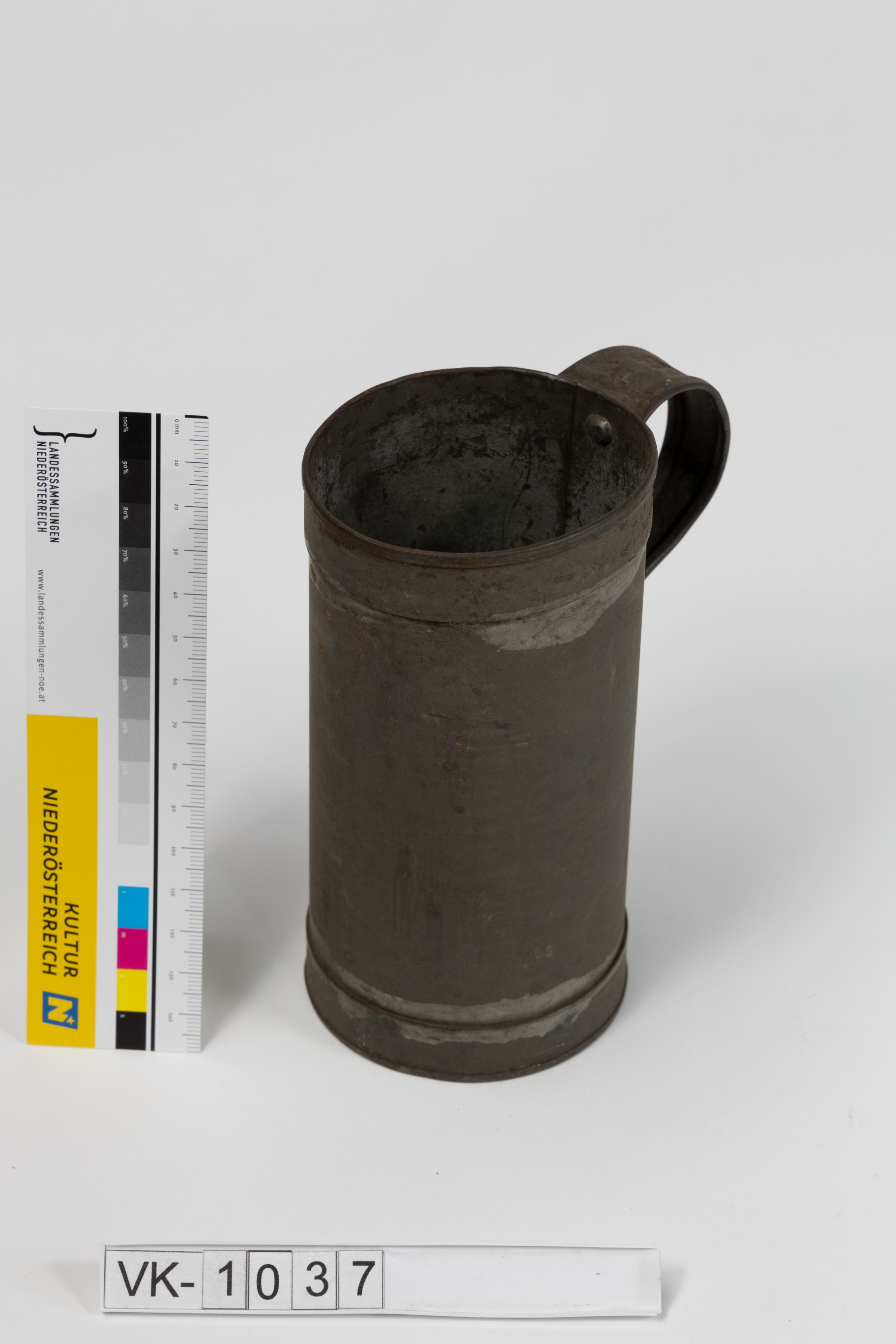 Zylindrischer Messbecher (1/2 l) mit einem randständigen Henkel und Punzierungen: Doppeladler, "34", "876".