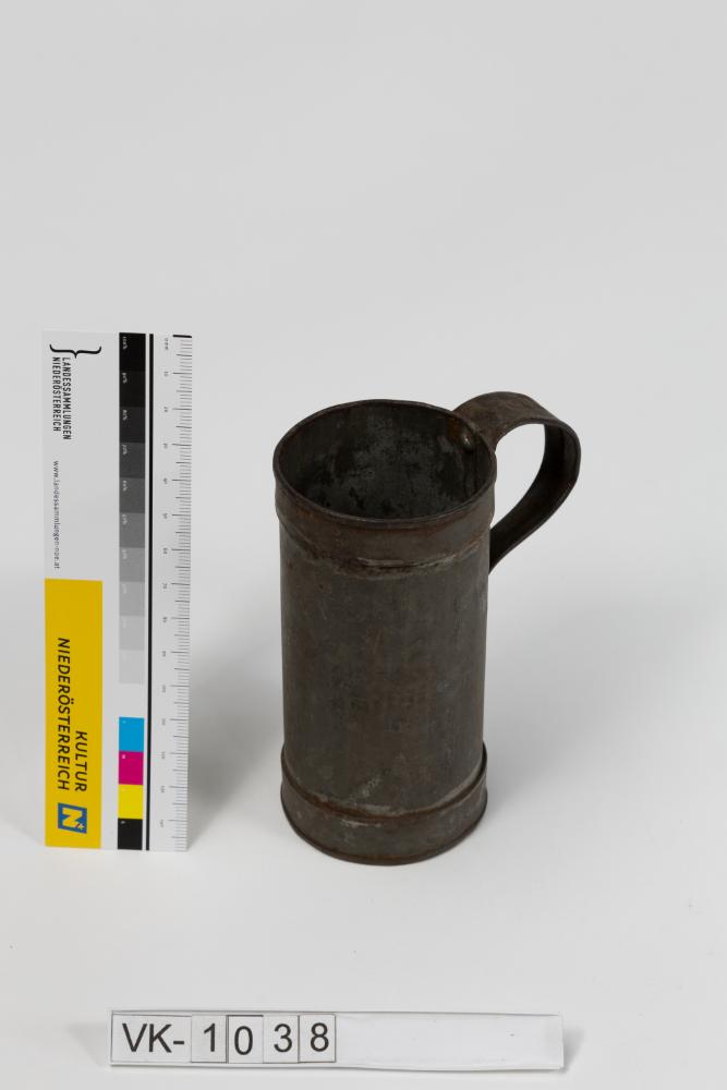 Zylindrischer Messbecher (1/4 l) mit einem randständigen Henkel und Punzierungen: Doppeladler, "34", "876".