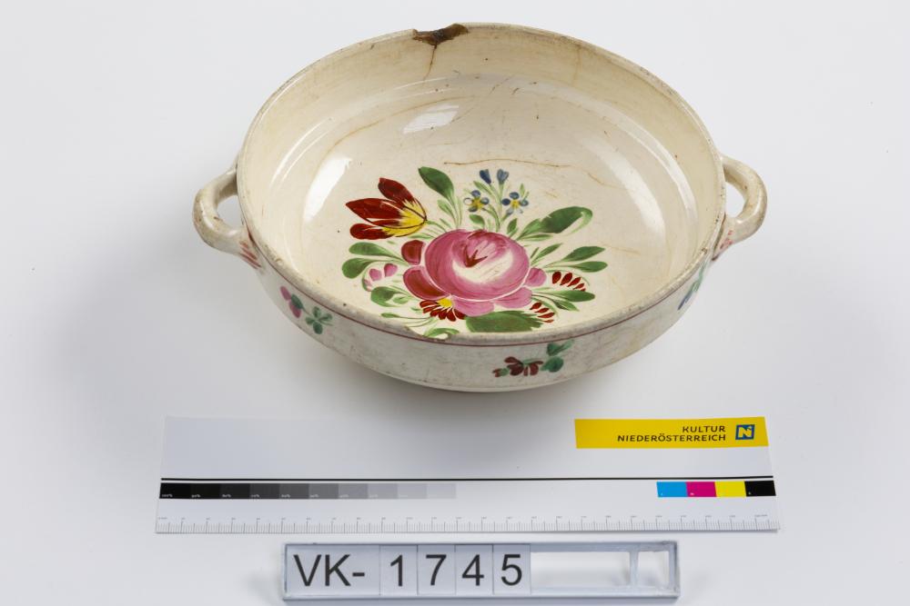 Weiß glasierte Schüssel mit zwei unterrandständigen Henklen und steiler Wandung; die Schüssel ist außen an der Wandung mit kleinen Blütenmotiven und auf dem Spiegel mit einem großen Blütenmotiv mit Blattwerk verziert.