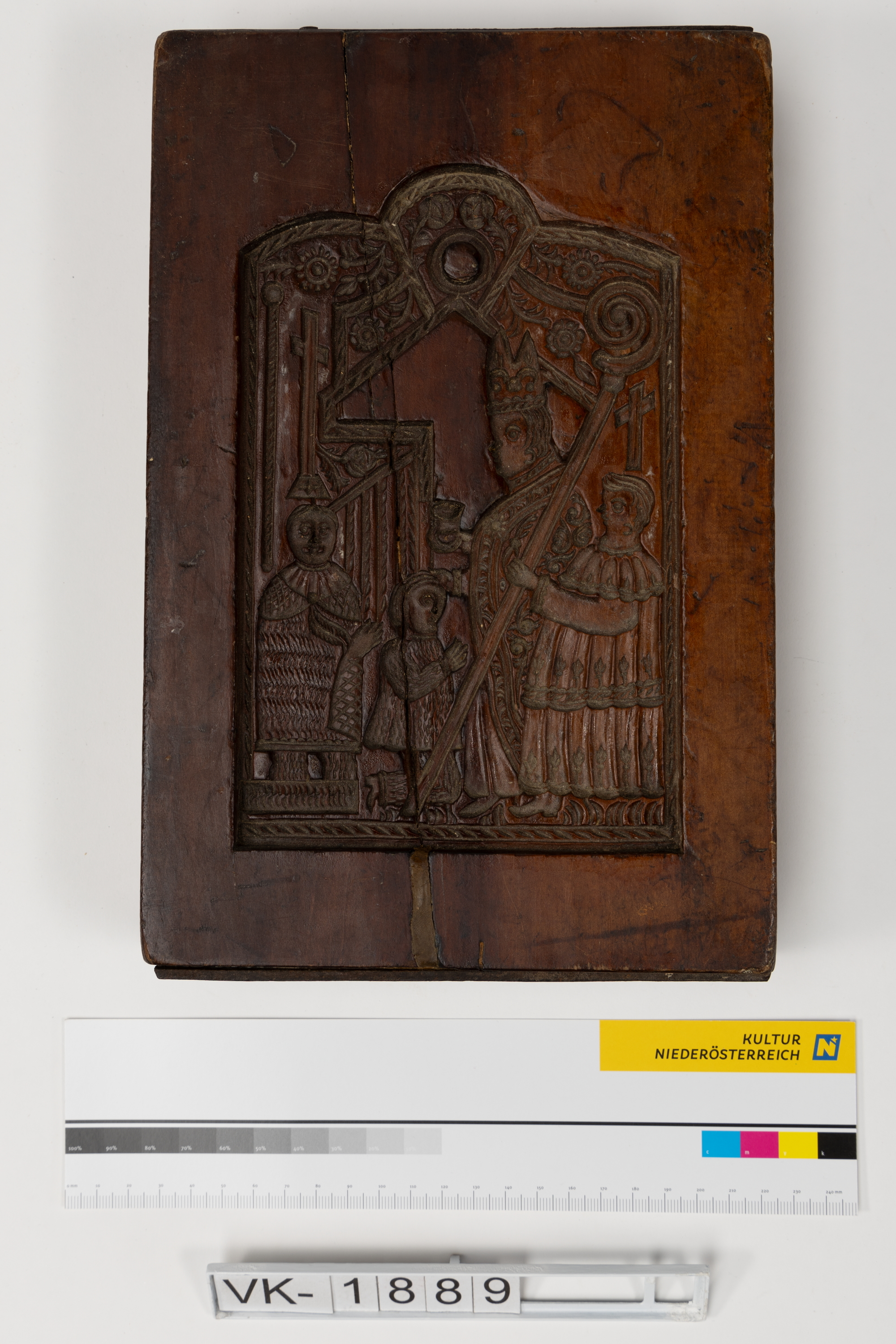 Quaderförmiges Model mit eingeschnitzter Negativform: Kirchliches Motiv mit vier Personen (Bischof, Kreuze, Ornamente).