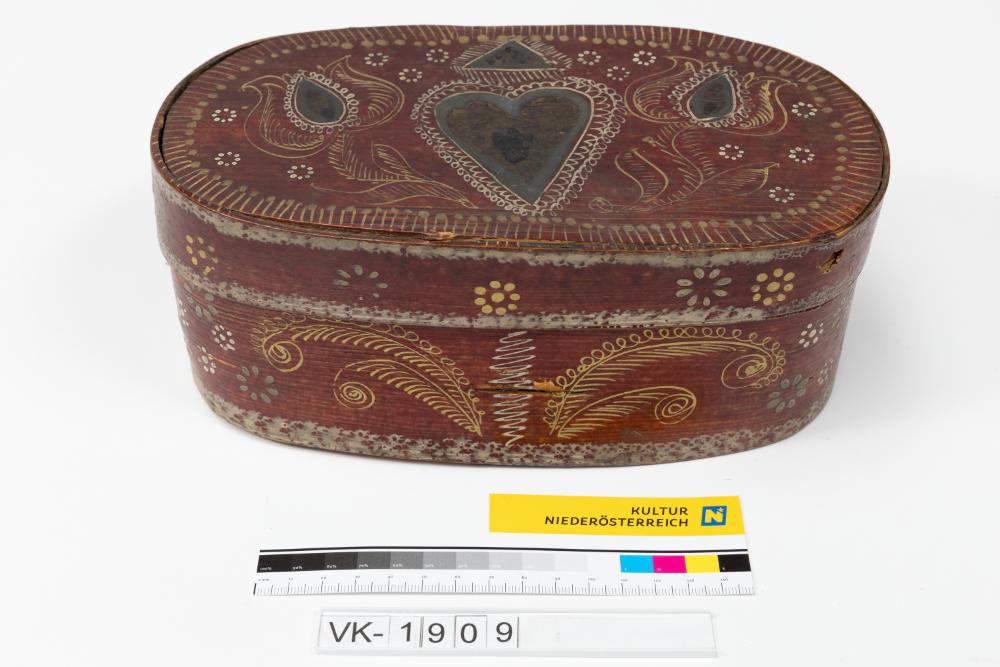 Ovale Holzschachtel mit roter Grundfarbe und mehrfärbigem feinen Dekor (Herzen, Blüten, Ranken).