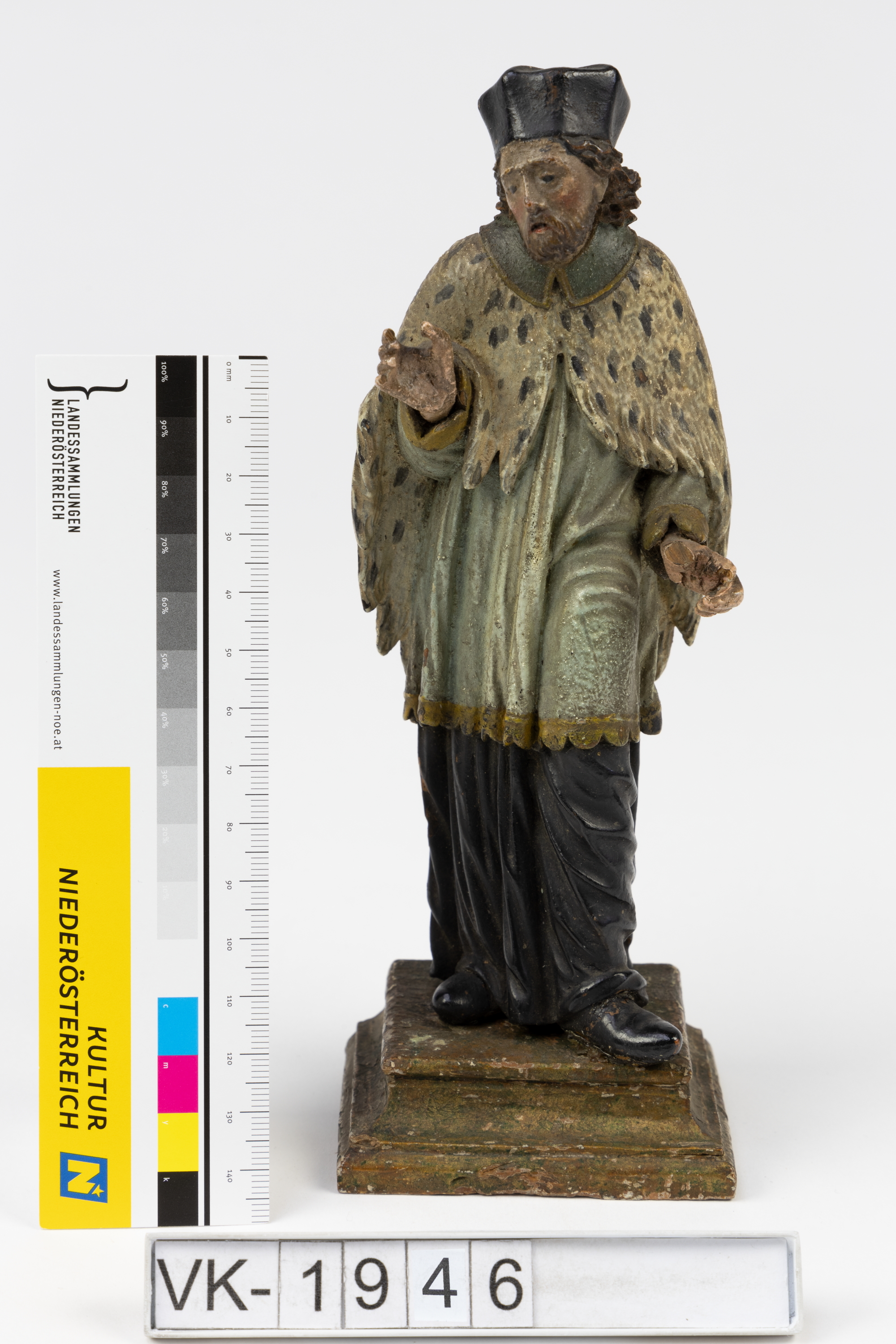 Mehrfärbig bemalte Figur (Hl. Johannes) auf einem Sockel (bäuerliche Holzschnitzarbeit).