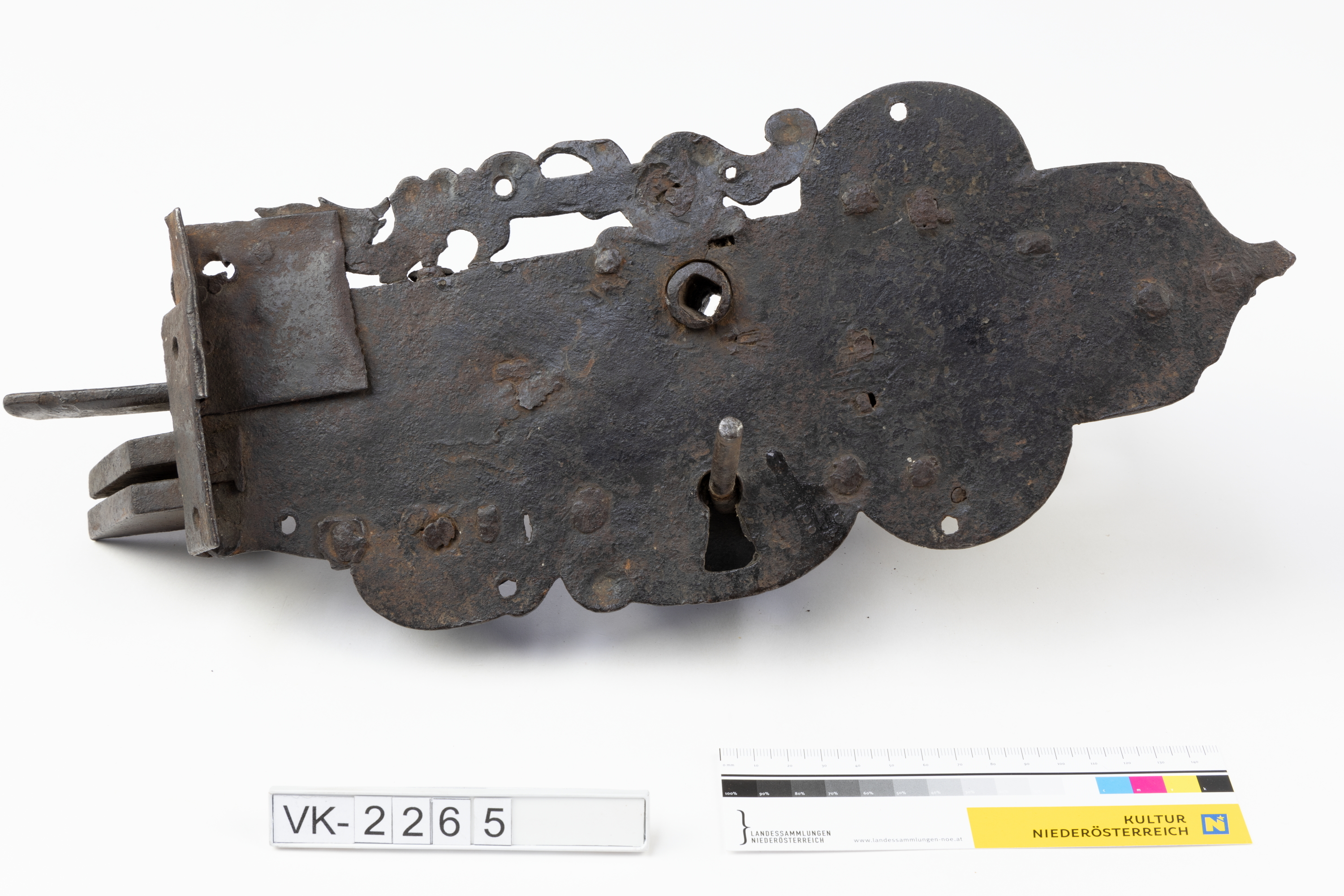 Schmiedeeisernes, teilweise offenes Türschloss auf einer verzierten und teilweise durchbrochenen Platte mit gewelltem Rand. Das Schloss hat eine mit Ziselierung verzierte Abdeckplatte, eine kuppelförmige Abdeckung über dem Schlüsselloch, eine Schnalle mit verziertem Griff sowie zwei Riegel und eine Hebelfalle.