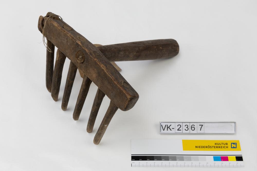Kleiner Streurechen aus Holz mit sechs Zähnen.