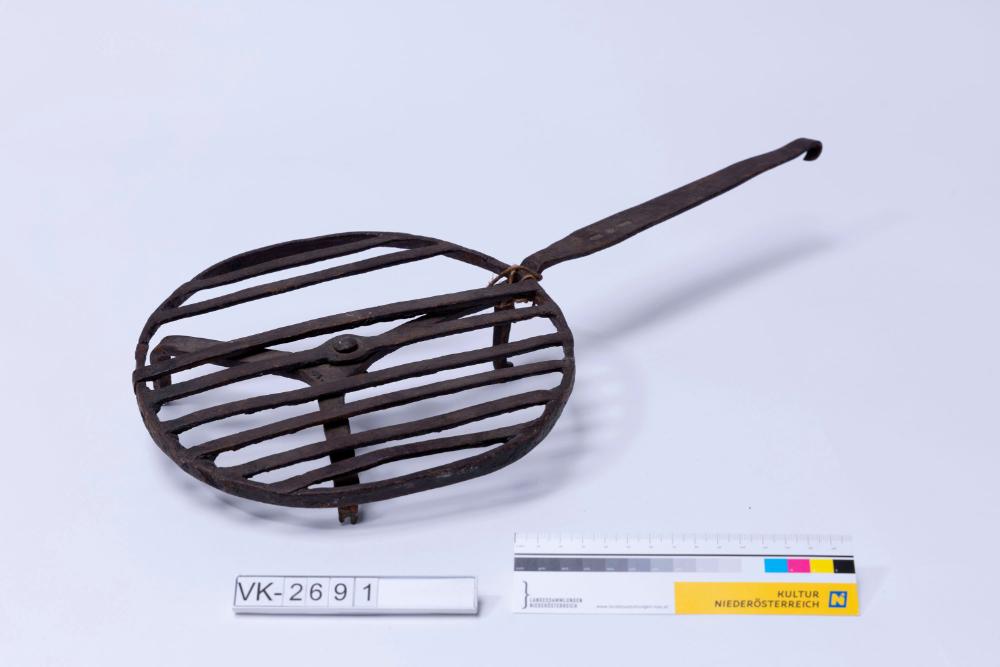 Dreifüßiger Pfannenuntersetzer (Pfannenknecht) mit langem Stiel (mit Schmiedezeichen) und einer runden Auflagefläche aus Eisenstreifen.