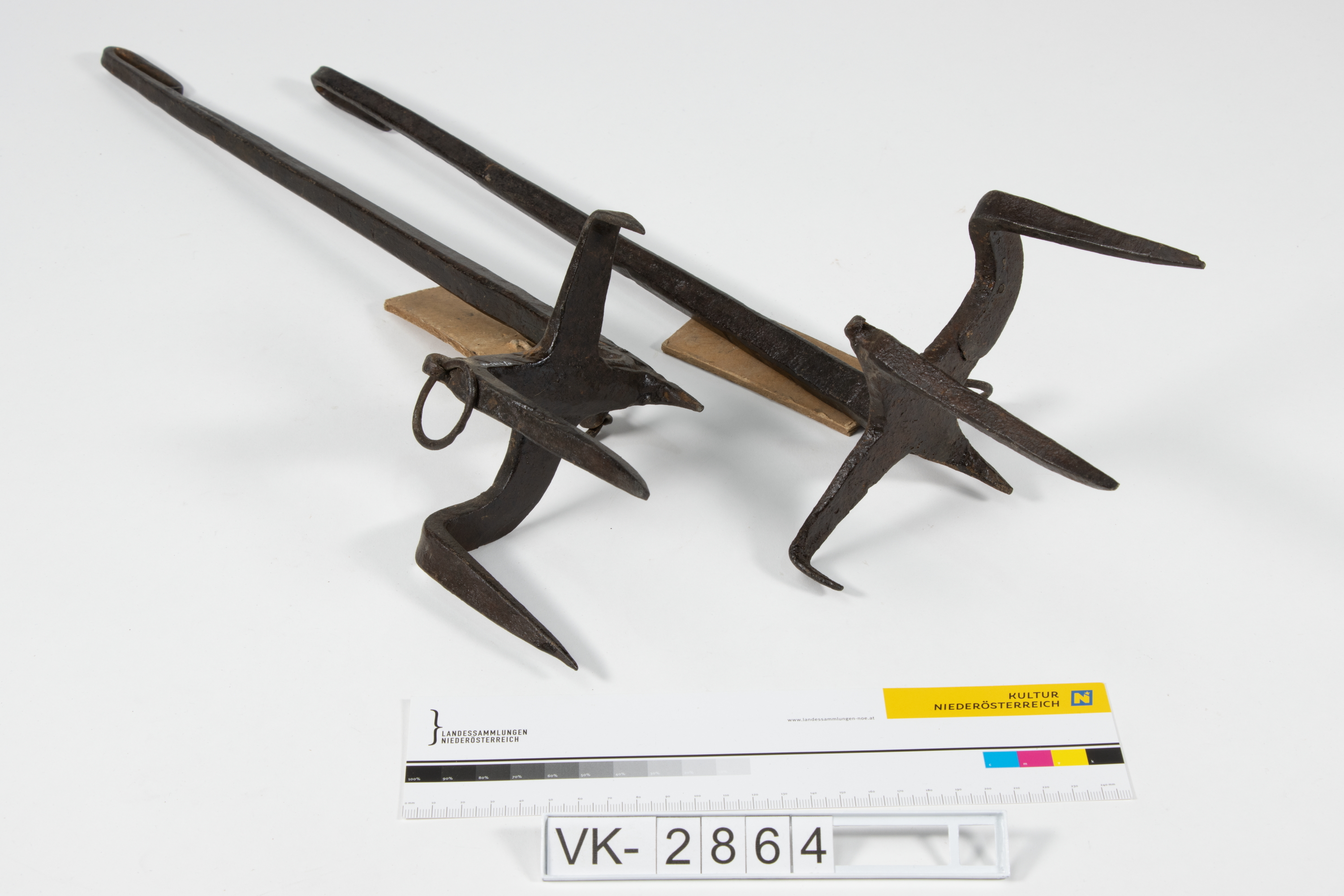 Zwei Steighilfen aus Eisen mit je zwei scharfen Spitzen und einer langen Stange mit Öse zur Fixierung unter dem Knie. Die Steighilfen dienen zum Besteigen von Bäumen.