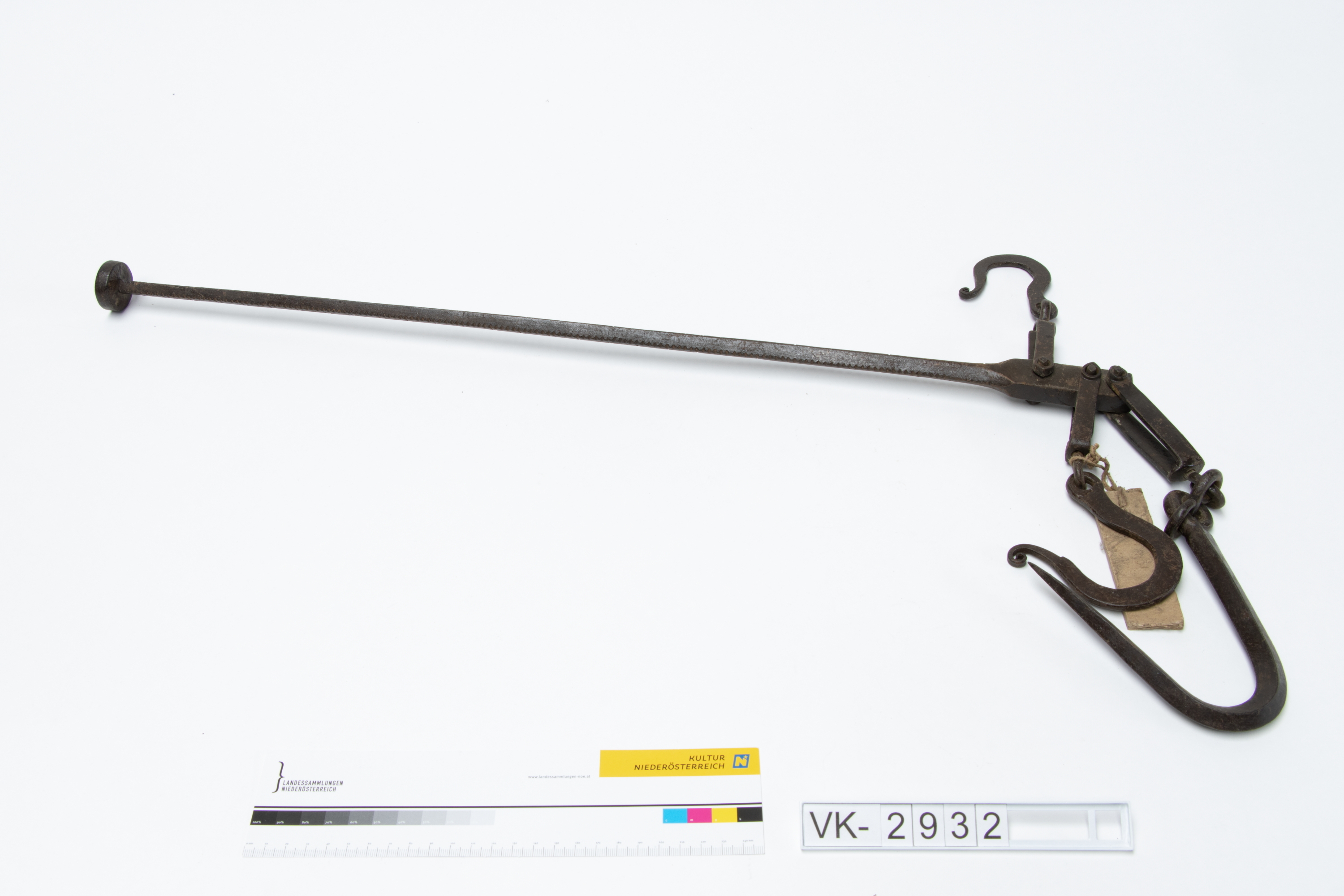 Schmiedeeiserne Laufgewichtswaage mit gezahnter Kante und eingeschlagener Skala; die Waage hat zwei kleine und einen großen Eisenhaken.