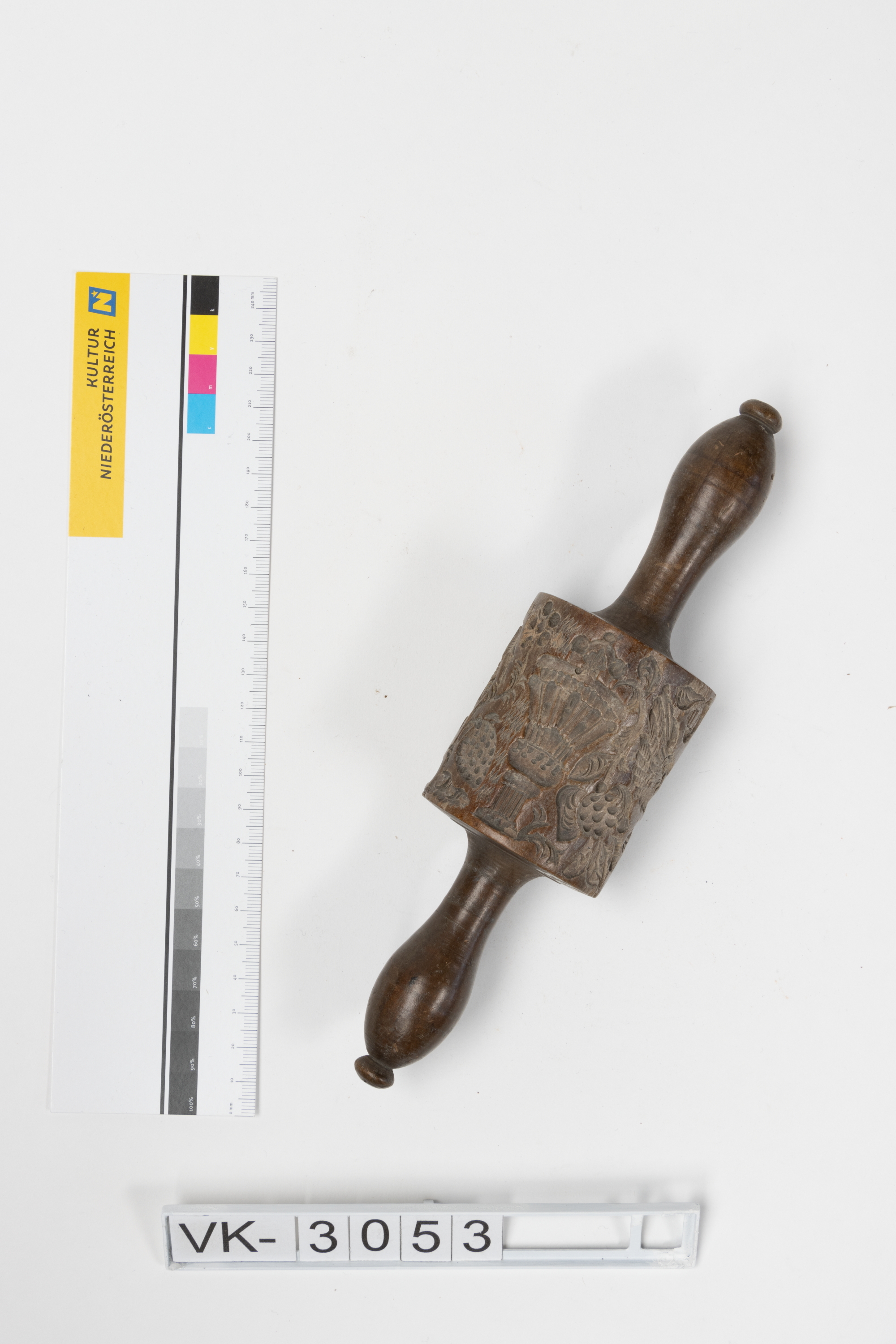 Rundes Lebzeltermodel mit umlaufendem floralen Motiv, einem Vogel und zwei Griffen.