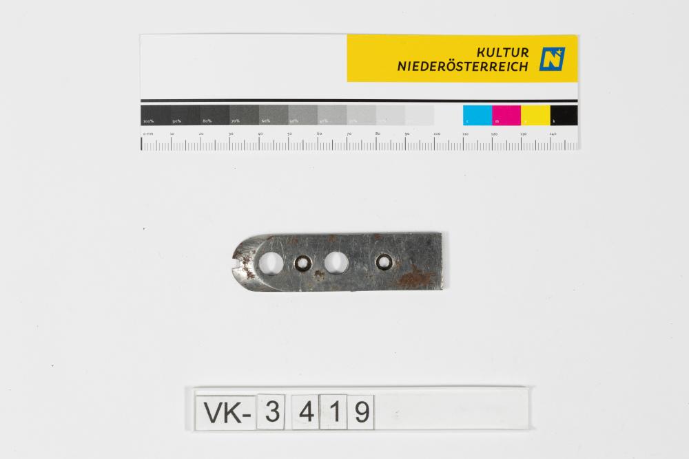 Annähernd rechteckige Stirnplatte, die zu einem Ende hin rund abschließt und zwei kleine und zwei größere Bohrungen aufweist. Laut Inventarbuch ist es Bestandteil einer Schusternähmaschine.
