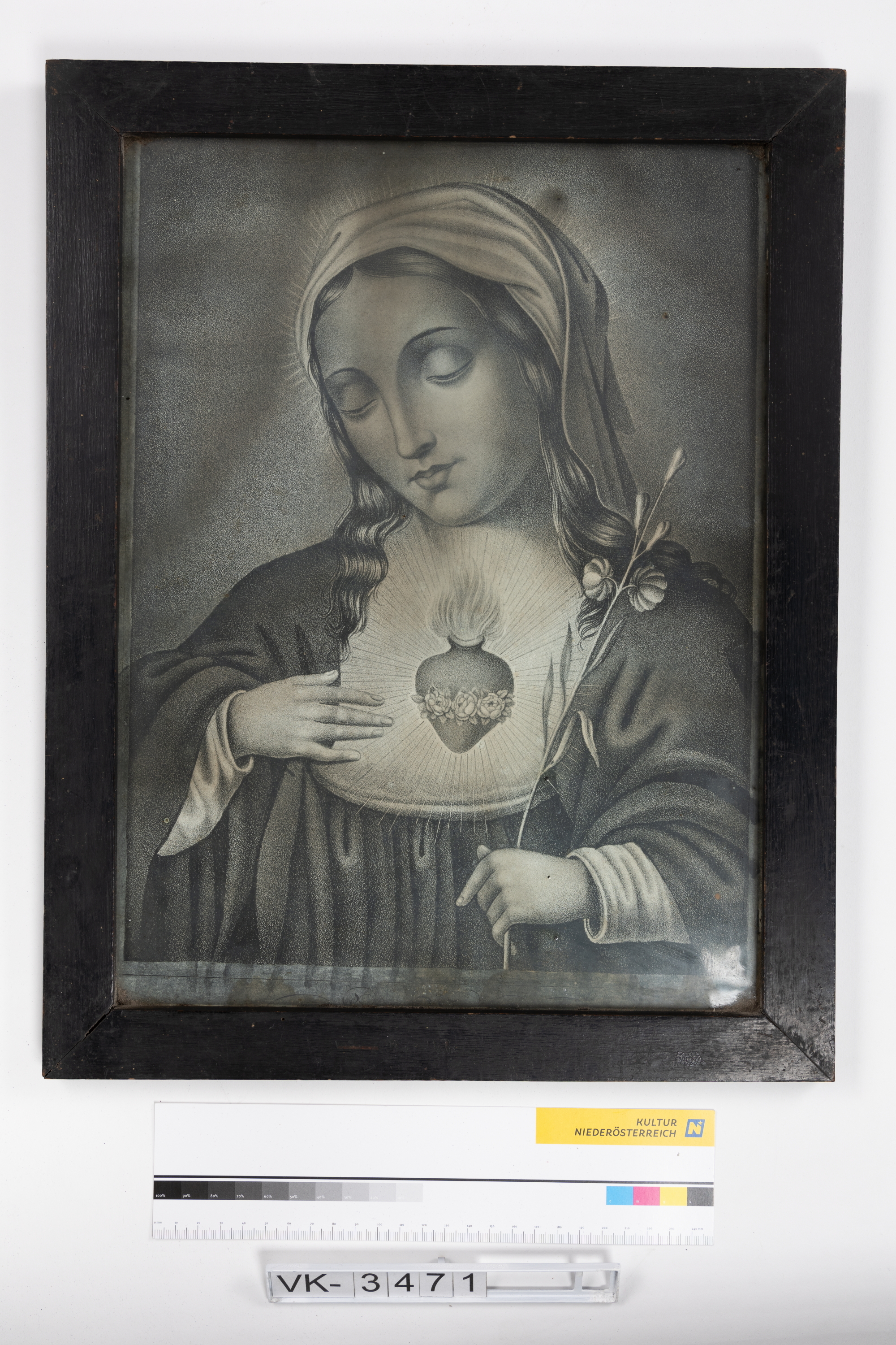 Stich hinter Glas in einem schwarzen Holzrahmen: Maria mit flammendem Herz.