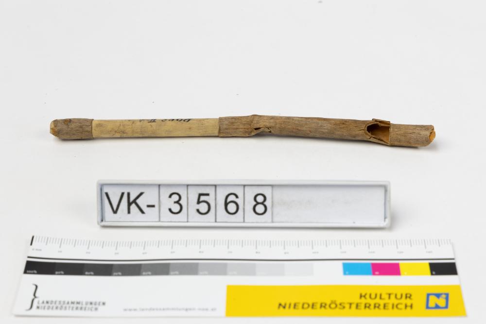 Aus der Rinde eines Zweiges hergestellte kleine Pfeife, laut Beitext ein Kinderspielzeug.