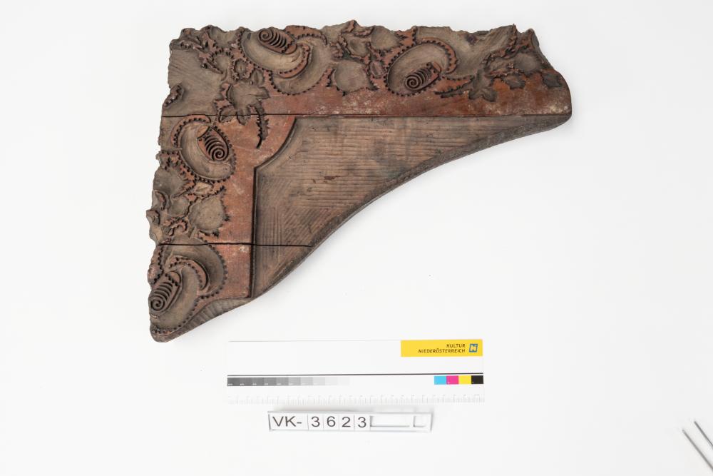 Großes Druckmodel aus Holz mit Metallstiften zum Einpassen. Druckmuster: L-förmig verlaufende Zierelemente, mit Resten roter Farbe.