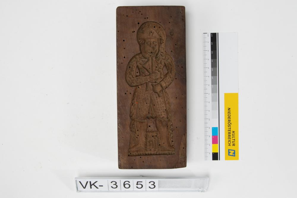 Lebzeltermodel mit eingeschnitzten Motiven auf beiden Seiten: Auf der einen Seite ein Mann mit Pelzmantel, auf der anderen Seite ein Mann in festlicher Tracht.