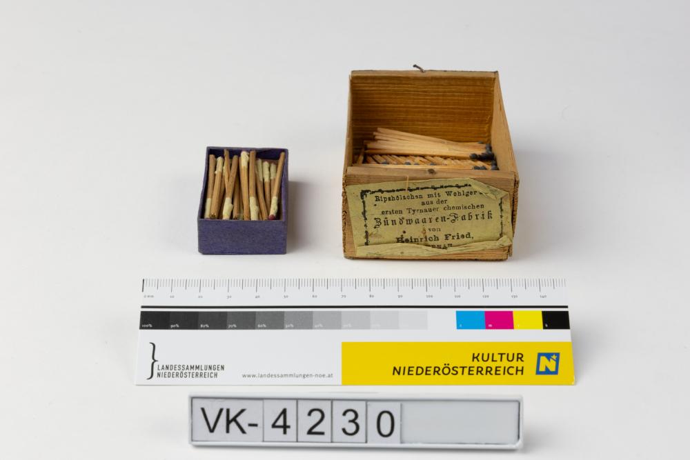 Konvolut unterschiedlicher Zündholzarten in einer offenen Holzschachtel.