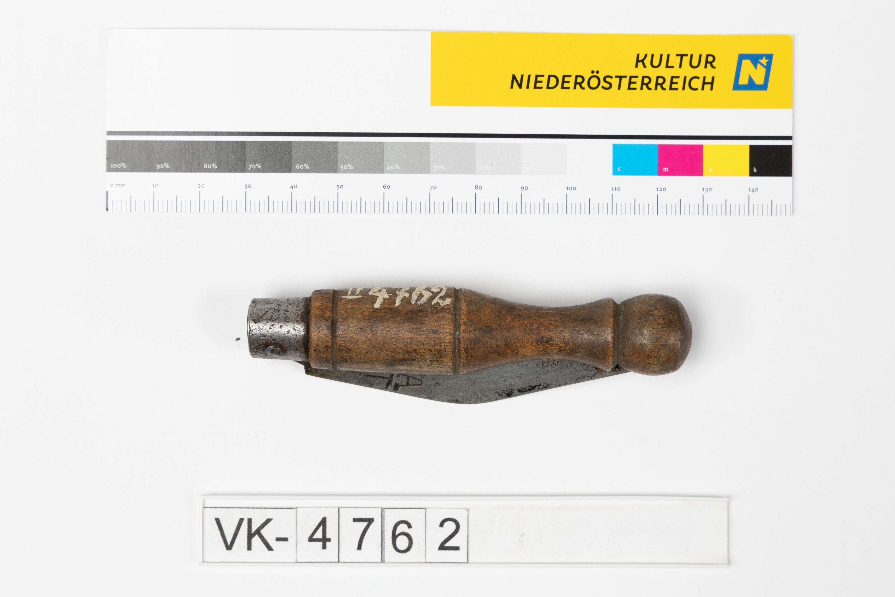 Taschenfeitel mit breiter, spitz zulaufender Klinge (eingeprägte Buchstaben "AT") und einem gedrechselten Holzgriff mit kugelförmigem Abschluss.
