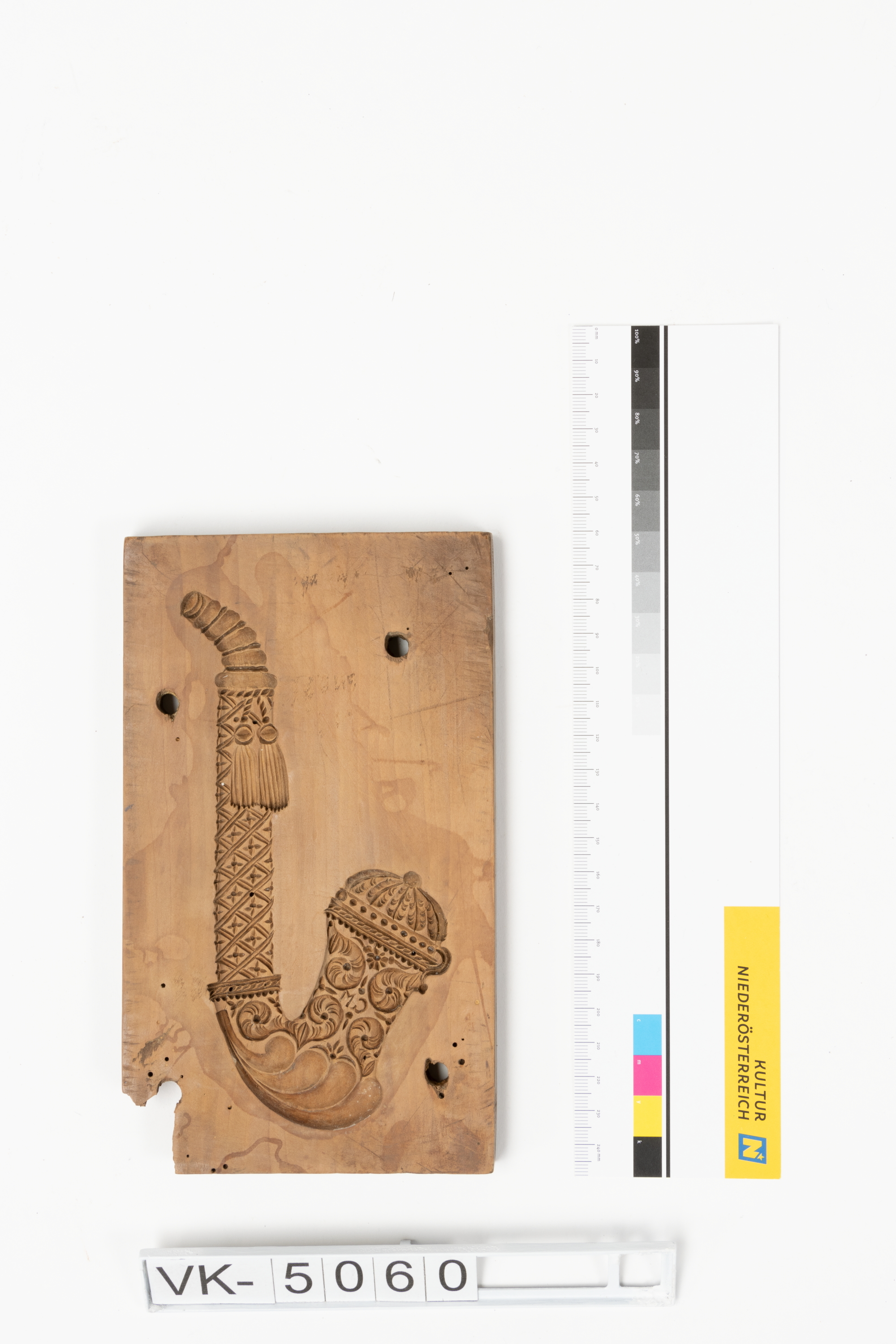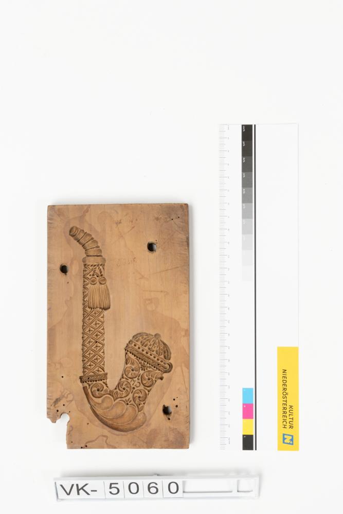 Quaderförmiges Lebzeltermodel mit eingeschnitztem Motiv: Eine verzierte Gesteckpfeife.