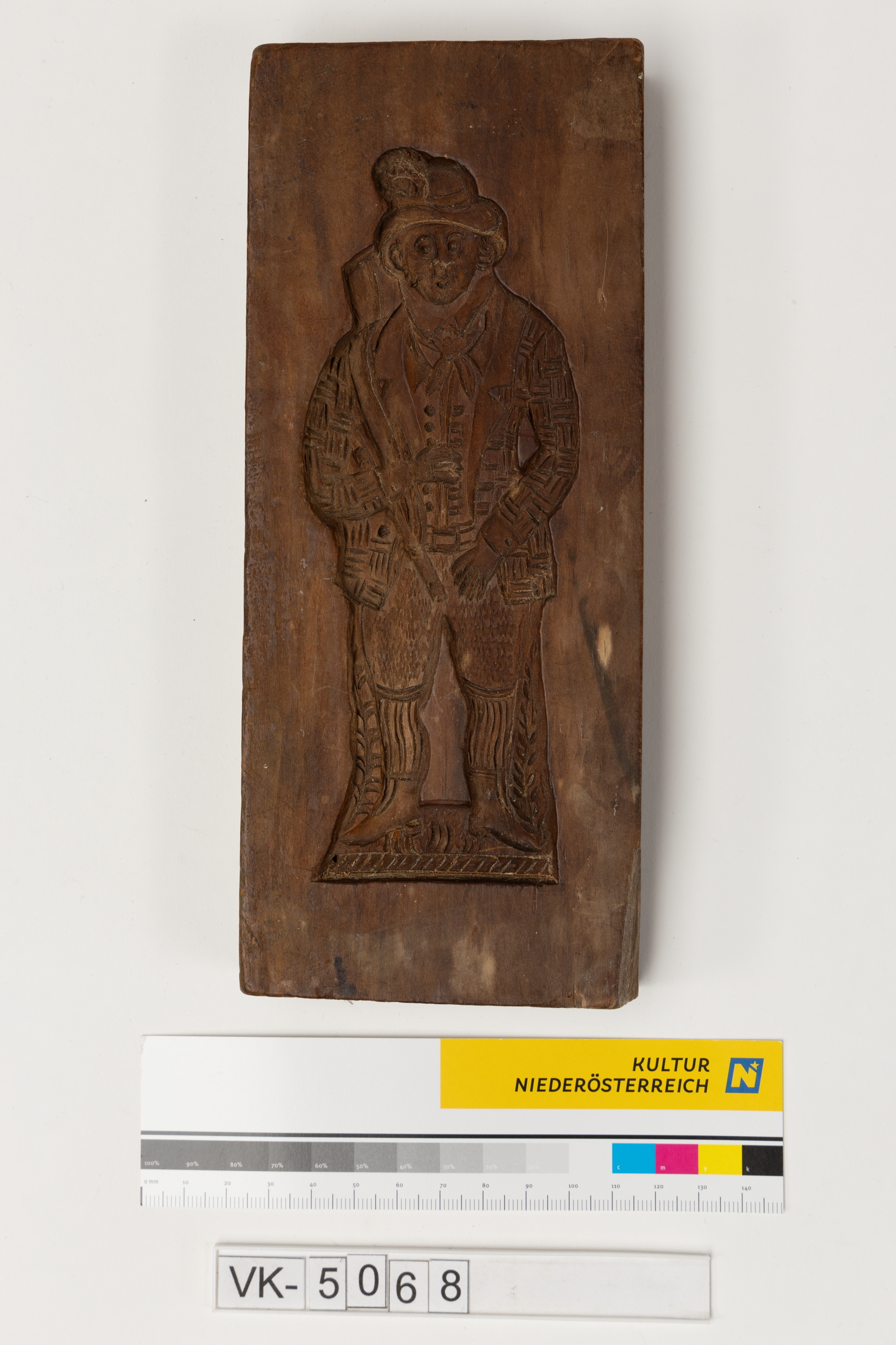 Quaderförmiges Model mit eingeschnitzten Negativformen auf zwei Seiten: Auf einer Seite ein Mann mit Hut, auf der anderen Seite ein Pärchen.