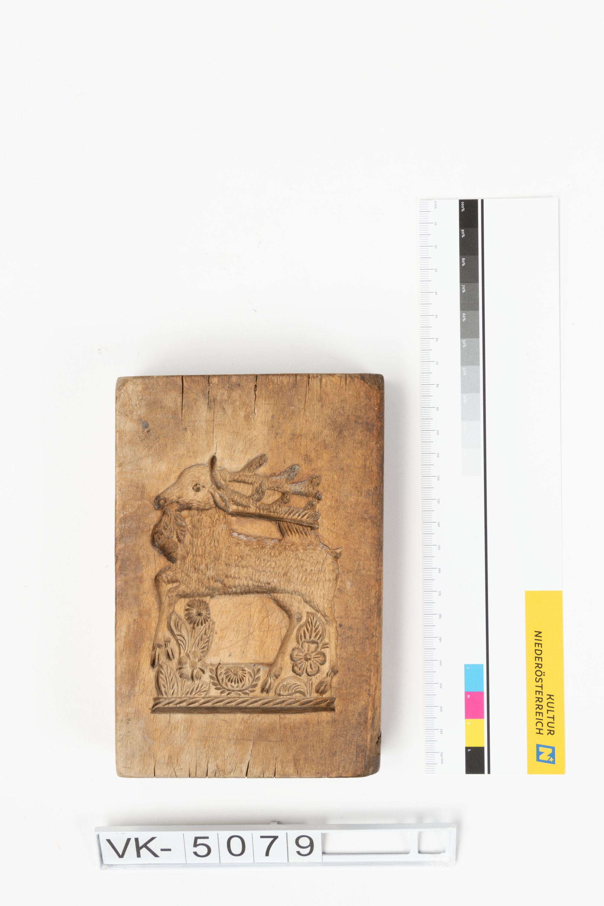 Lebzeltermodel aus Holz mit eingeschnitzten Motiven auf beiden Seiten: Auf einer Seite ein Hirsch mit Blumen, auf der anderen Seite Zierbänder. Zusätzlich sind in das Model die Initialen "FG" eingeschnitzt.