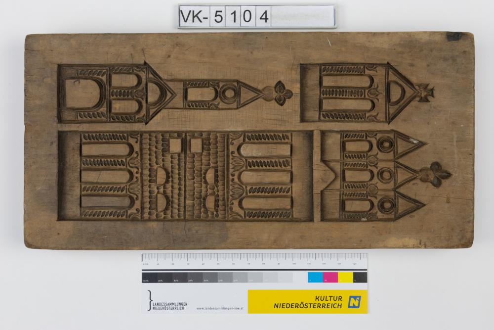Quaderförmiges Lebzeltermodel mit zwei Negativformen: Bauteile für eine Kirche, Bauteile für eine Wiege.