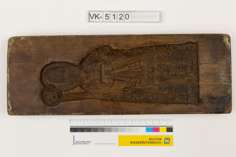 Quaderförmiges Lebzeltermodel mit zwei Negativformen (Nikolausdarstellung, Mann in Tracht mit einem Hut).