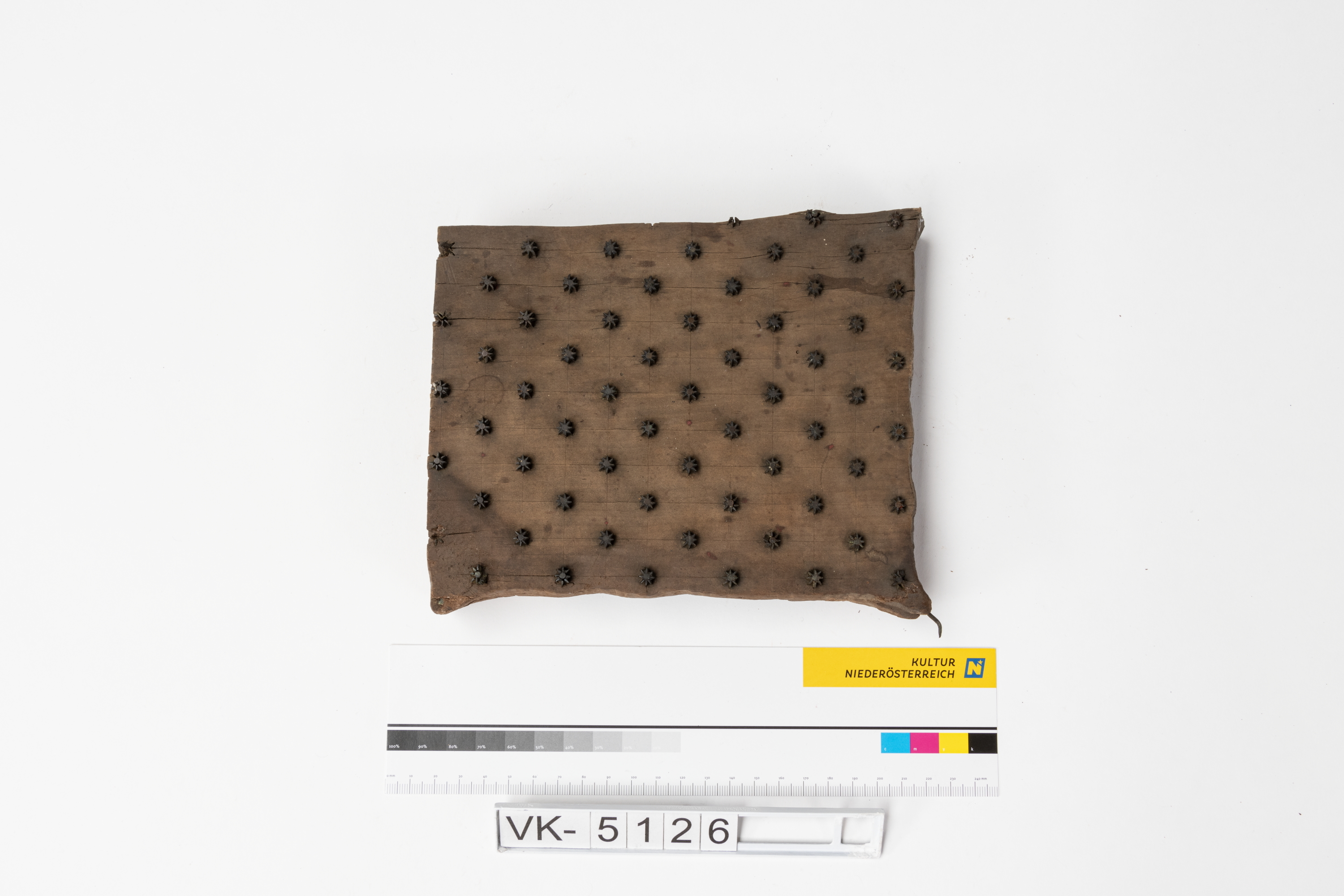 Färbermodel aus Holz mit Metallelementen und zwei Kerben. Druckmuster: Kleine Sterne.