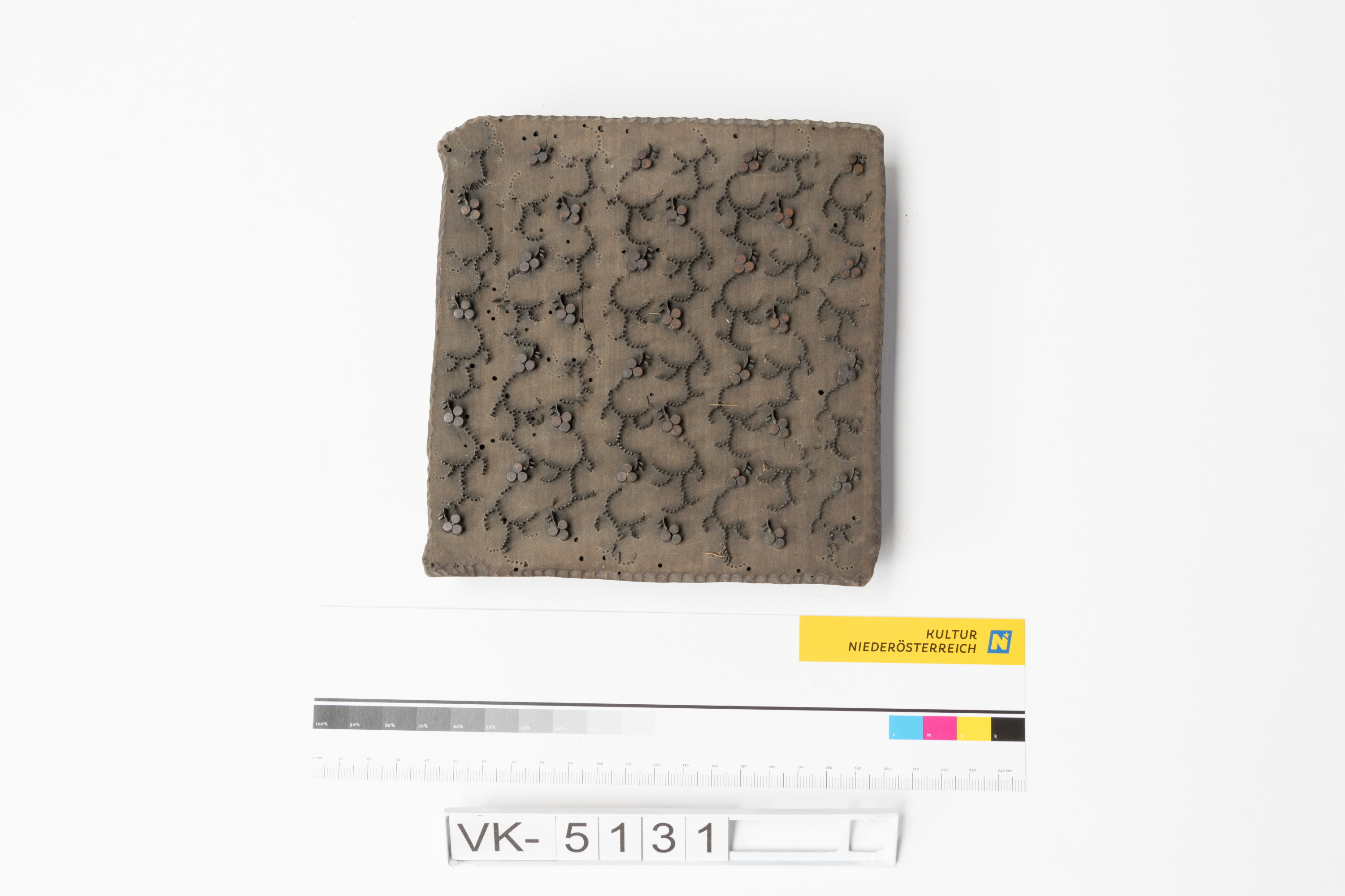 Färbermodel aus Holz mit Metallelementen und zwei Kerben. Druckmuster: Gepunktete Ranken und kleine Blüten.