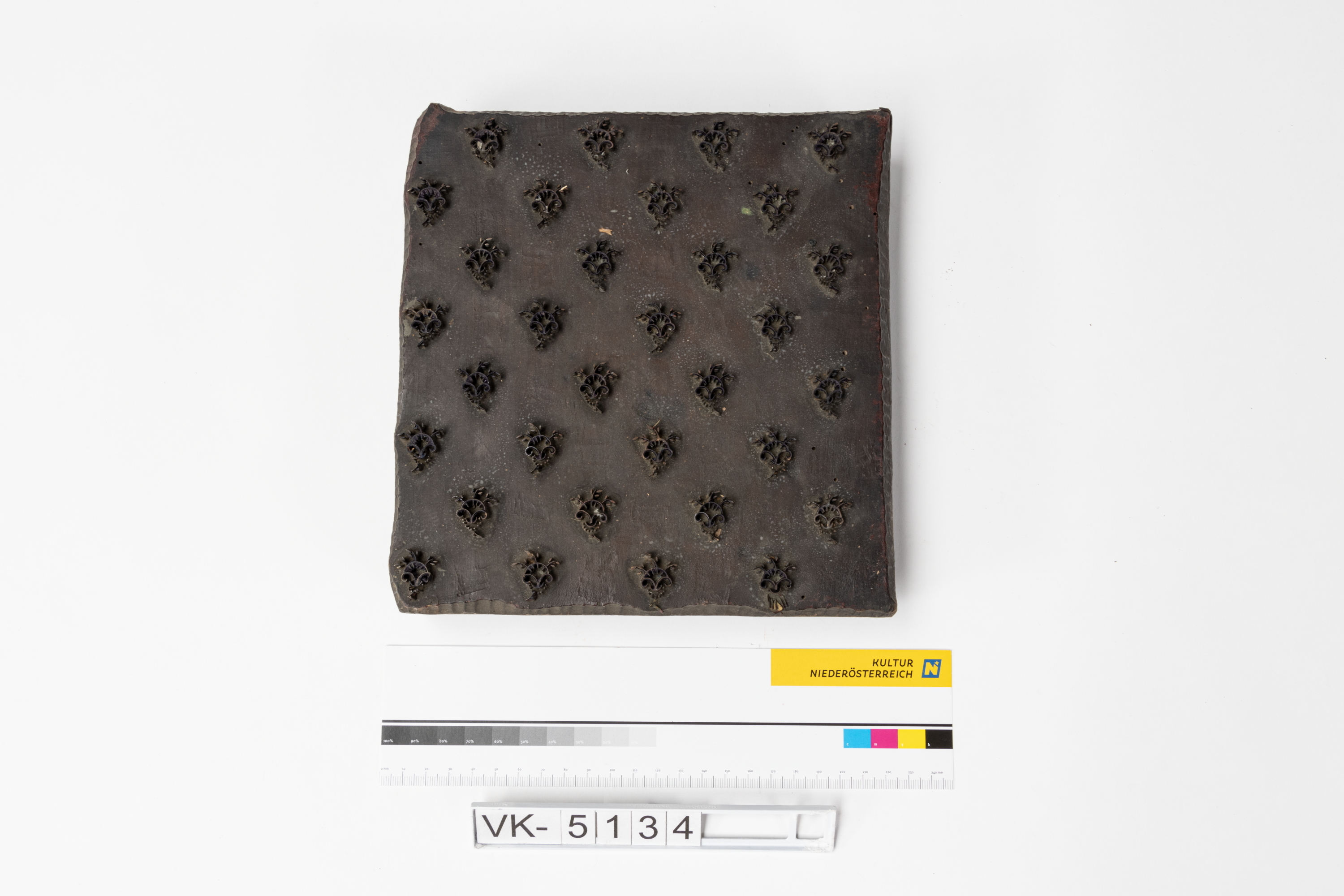 Färbermodel aus Holz mit Metallelementen und zwei Kerben. Druckmuster: Blumen.