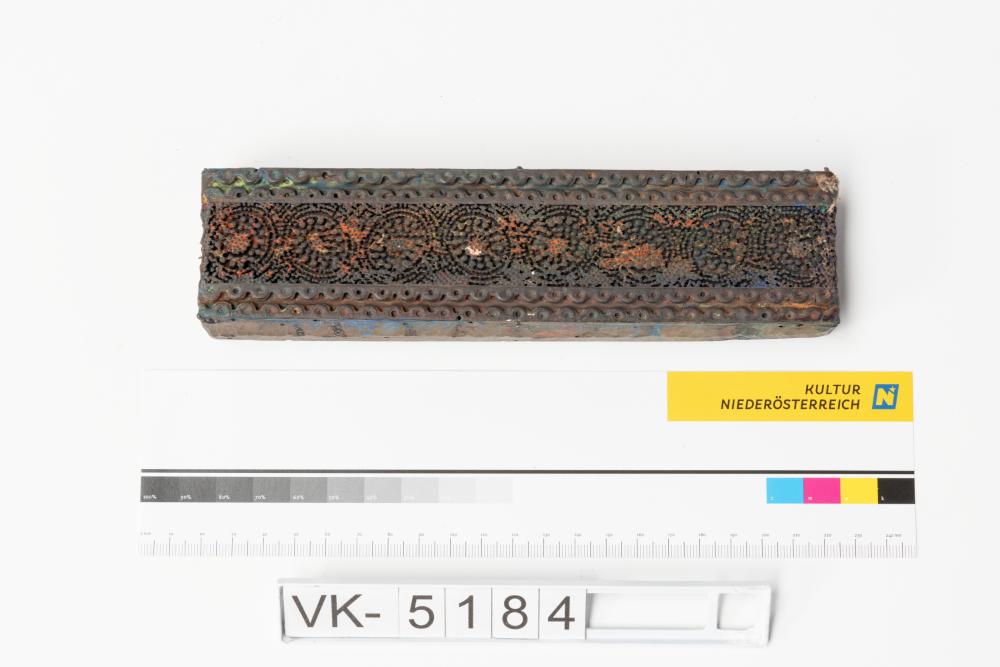 Längliches Färbermodel aus Holz mit Metallstiften und zwei Kerben. Druckmuster: Borte, mit Resten unterschiedlicher Farben.