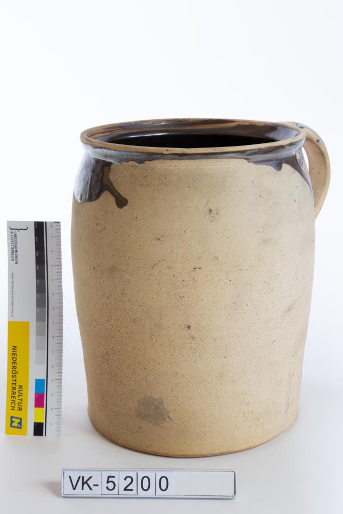 Tontopf mit einem randständigen Henkel und brauner Glasur an der Innenseite.
