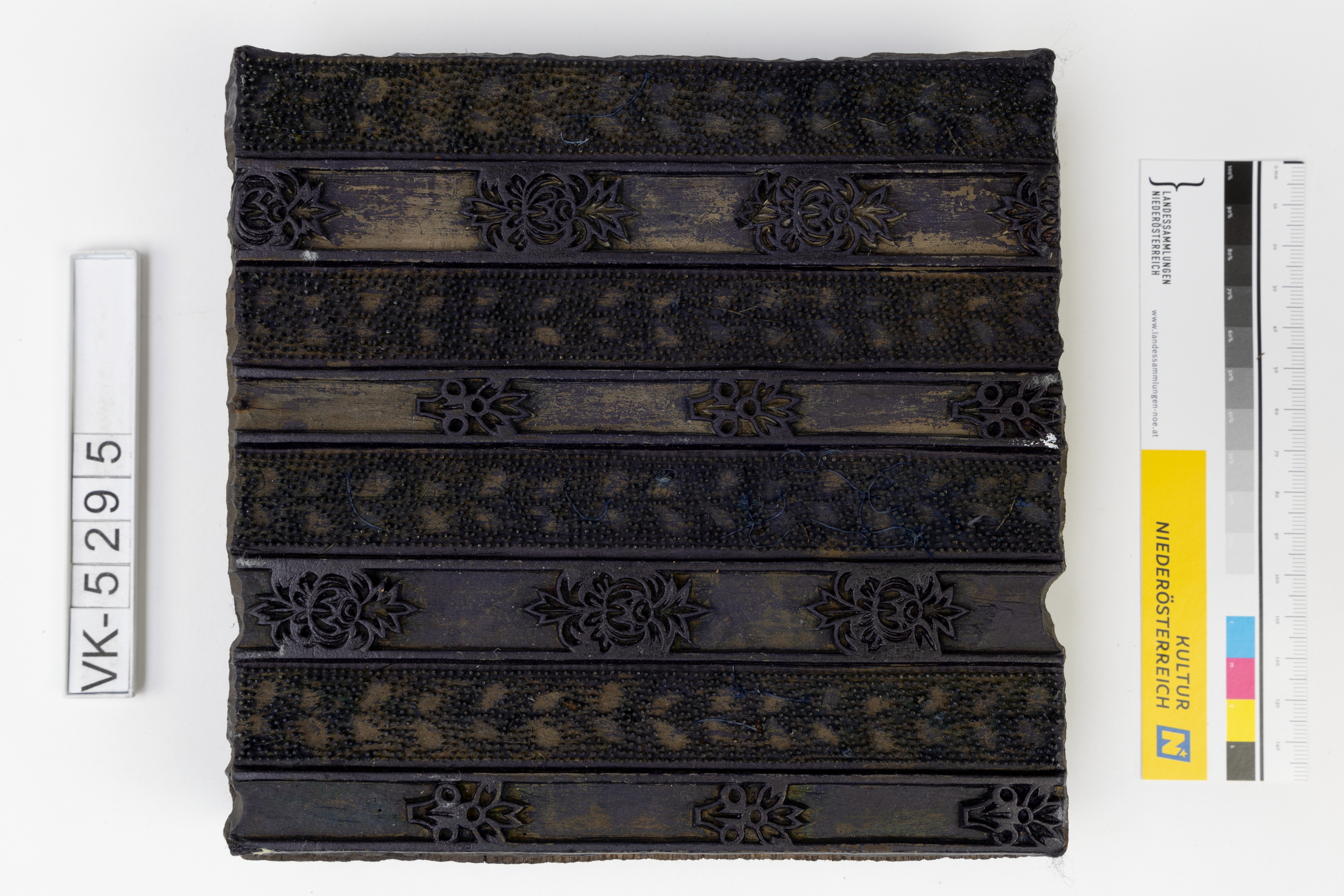 Färbermodel aus Holz mit Metallstiften auf einer Trägerplatte mit zwei Kerben. Druckmuster: Linien mit floralen Elementen und Linien mit gepunkteten Blättchen, (Muster Nr. 192 des Druckers), mit Resten dunkler Farbe.