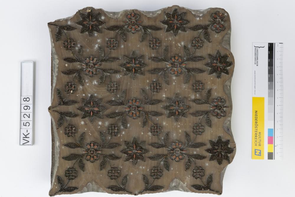 Färbermodel aus Holz mit Metallelementen auf einer Trägerplatte mit zwei Kerben. Druckmuster: Unterschiedliche Blüten mit Blättern, (Muster Nr. 191 des Druckers).