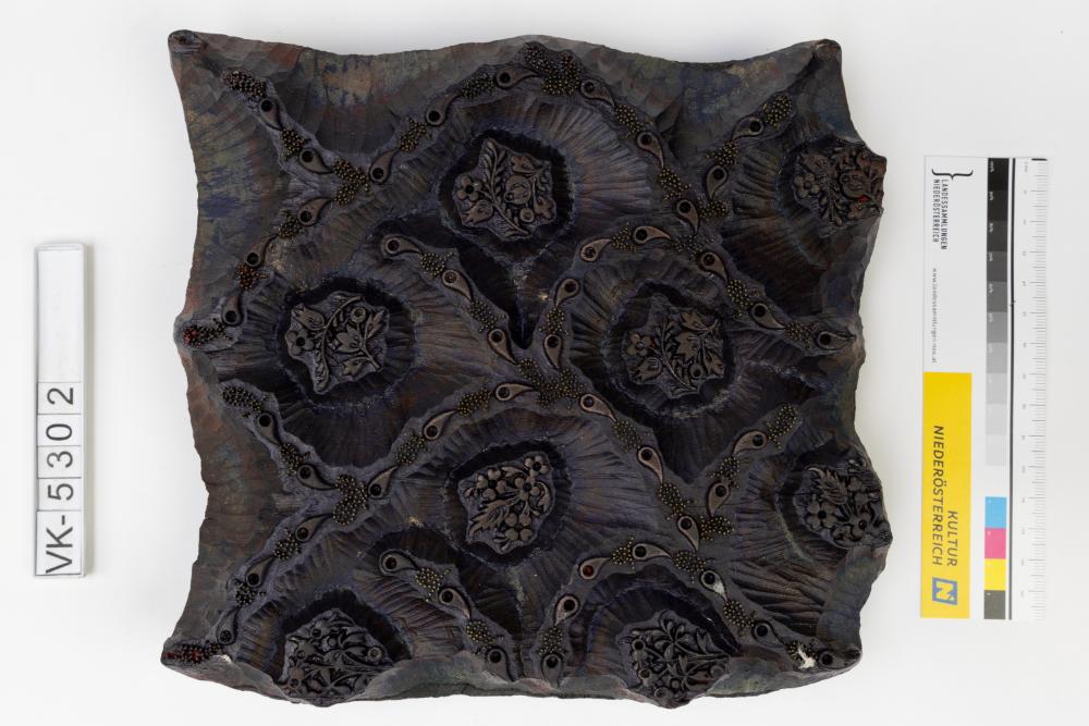 Färbermodel aus Holz mit Metallstiften auf einer Trägerplatte mit zwei Kerben. Druckmuster: Florale Elemente, dazwischen Linien aus Tropfenformen, (Muster Nr. 169 des Druckers), mit Resten dunkler Farbe.
