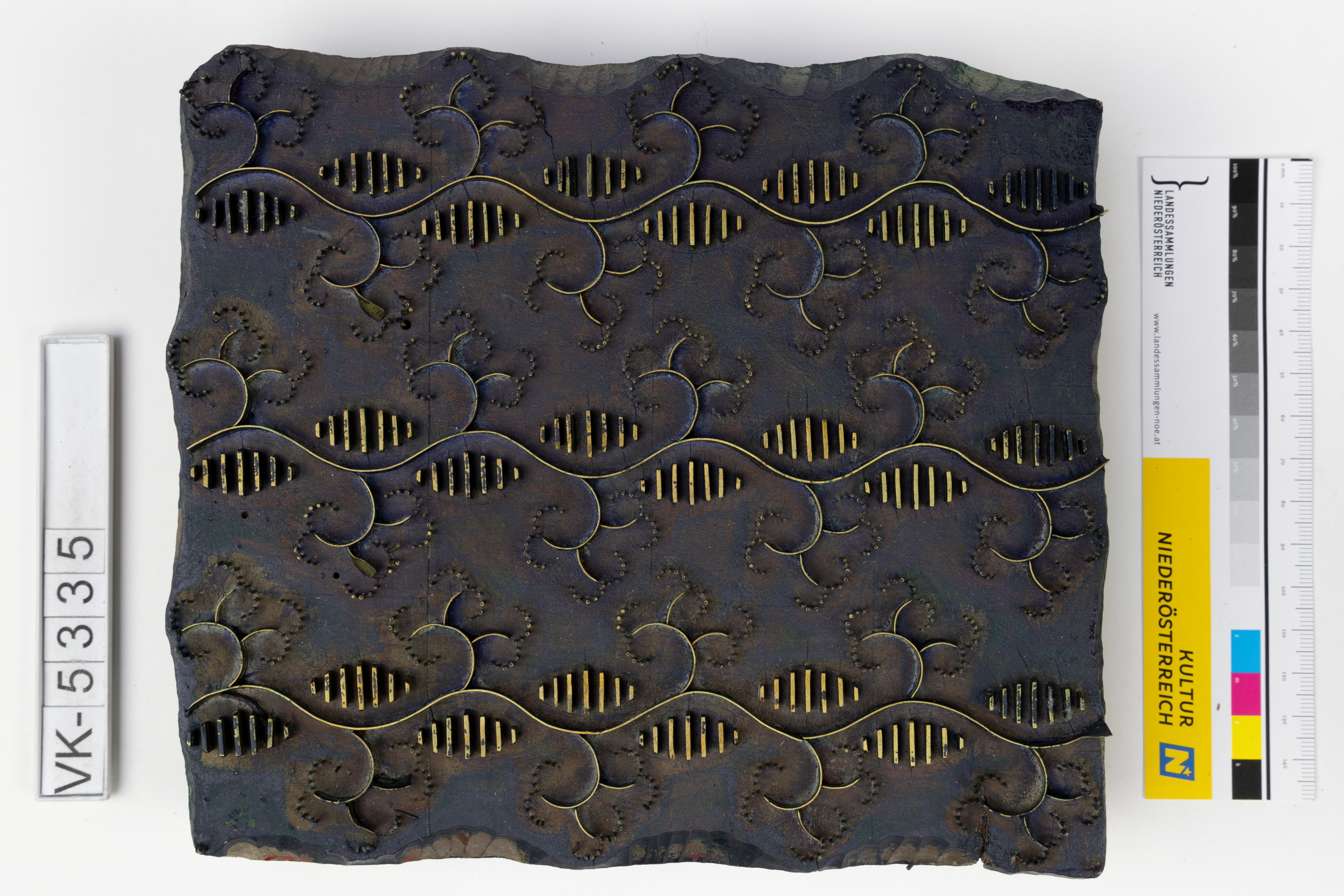 Färbermodel aus Holz mit Metallelementen auf einer Trägerplatte mit zwei Kerben. Druckmuster: Wellenlinien mit Streifen und Ranken, (Muster Nr. 159 des Druckers), mit Resten dunkler Farbe.