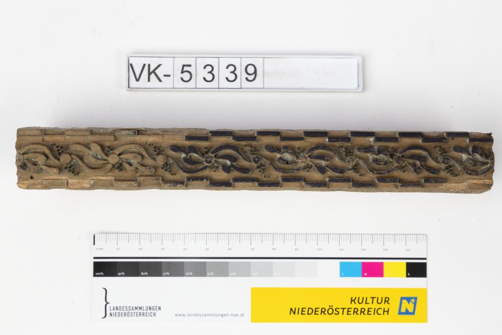 Längliches Färbermodel aus Holz mit Metallstiften und zwei Kerben. Druckmuster: Blattborte, (Muster Nr. 209 des Druckers).