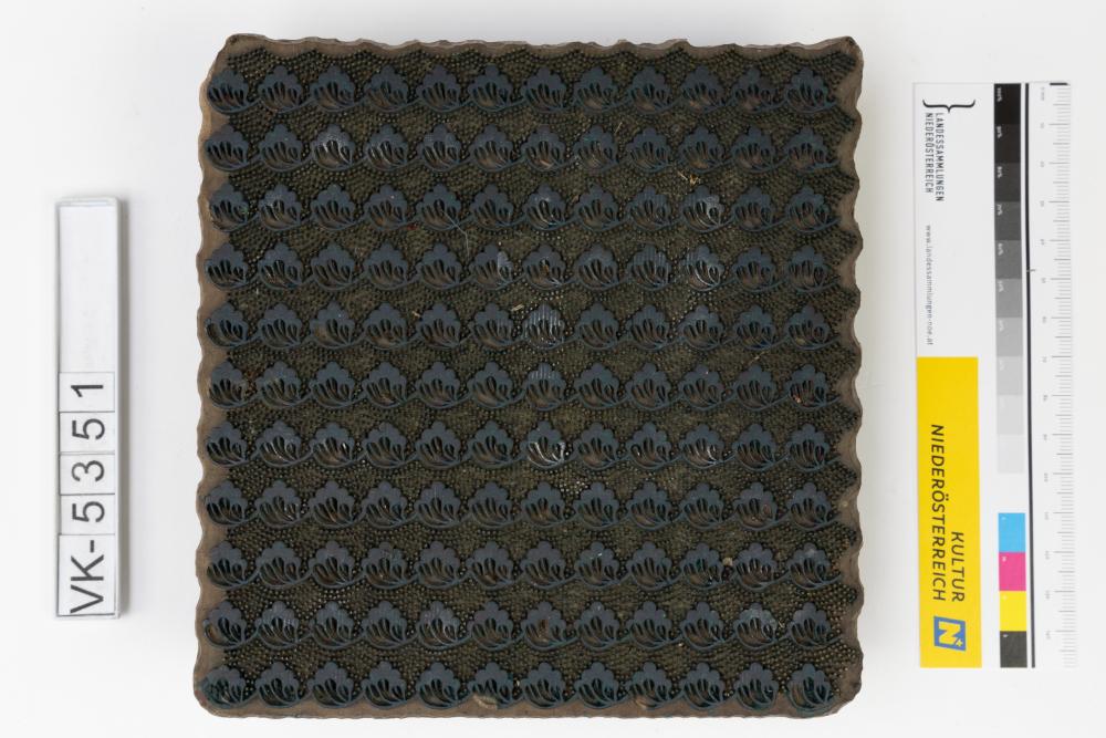 Färbermodel aus Holz mit eingeschlagenen Metallstiften auf einer Trägerplatte mit zwei Kerben. Druckmuster: Blättchenborten, dazwischen Pünktchen, (Muster Nr. 47 des Druckers), mit Resten grüner Farbe.