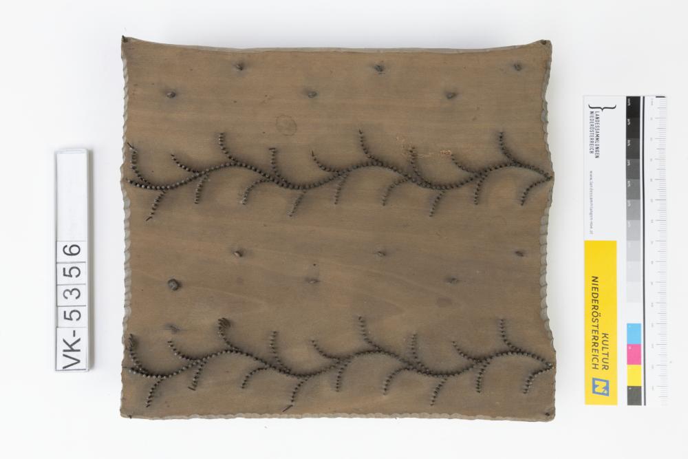 Färbermodel aus Holz mit eingeschlagenen Metallstiften auf einer Trägerplatte mit zwei Kerben. Druckmuster: Ranken, (Muster Nr. 105 des Druckers).