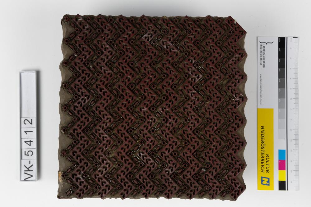 Färbermodel aus Holz mit eingeschlagenen Metallstiften auf einer Trägerplatte mit zwei Kerben. Druckmuster: Zickzack-Linien mit Herzen, dazwischen geometrische Elemente mit Pünktchen, (Muster Nr. 1 des Druckers), mit Resten roter Farbe.