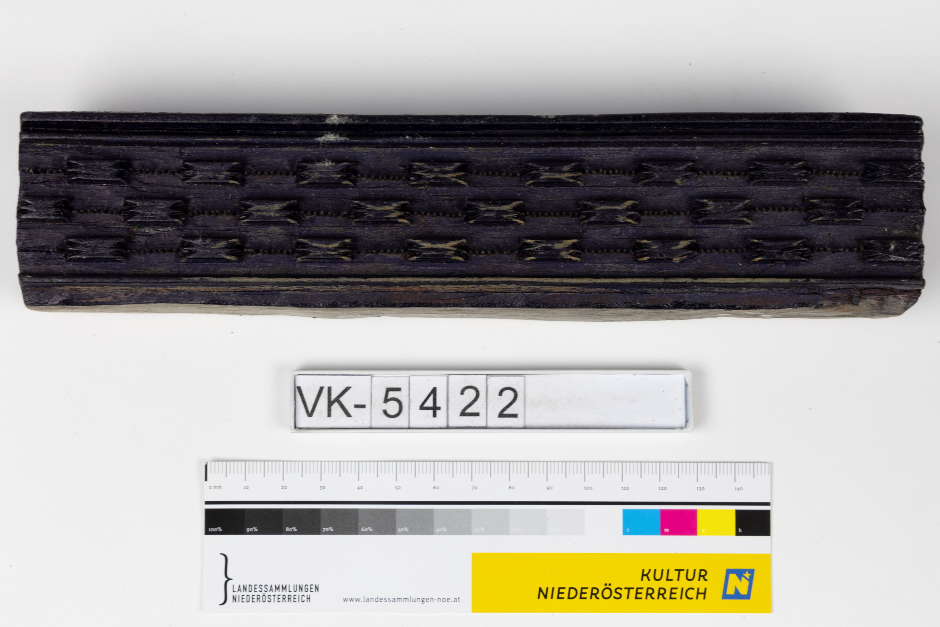 Färbermodel aus Holz mit eingeschlagenen Metallstiften. Druckmuster: Gerade Linien und gemusterte Borte, (Muster Nr. 206 des Druckers), mit Resten blauer Farbe.