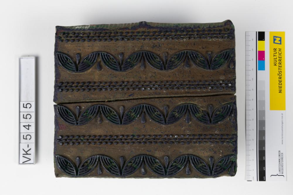 Färbermodel aus Holz mit Metallstiften an den Ecken auf einer Trägerplatte mit zwei Kerben. Druckmuster: Abwechselnd gepunktete Linien und wellenförmige Elemente, (Muster Nr. 28 des Druckers) mit Resten blauer Farbe.