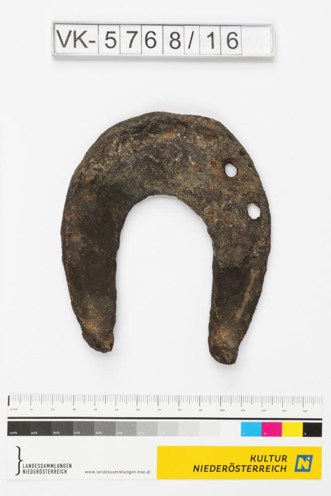 Hufeisen mit Löchern für Nägel für Pferde kleinen Schlages, die man als ungarische Steppenpferde erachtet. Laut Inventarbuch aus der Avaren- oder der Magyarenzeit.