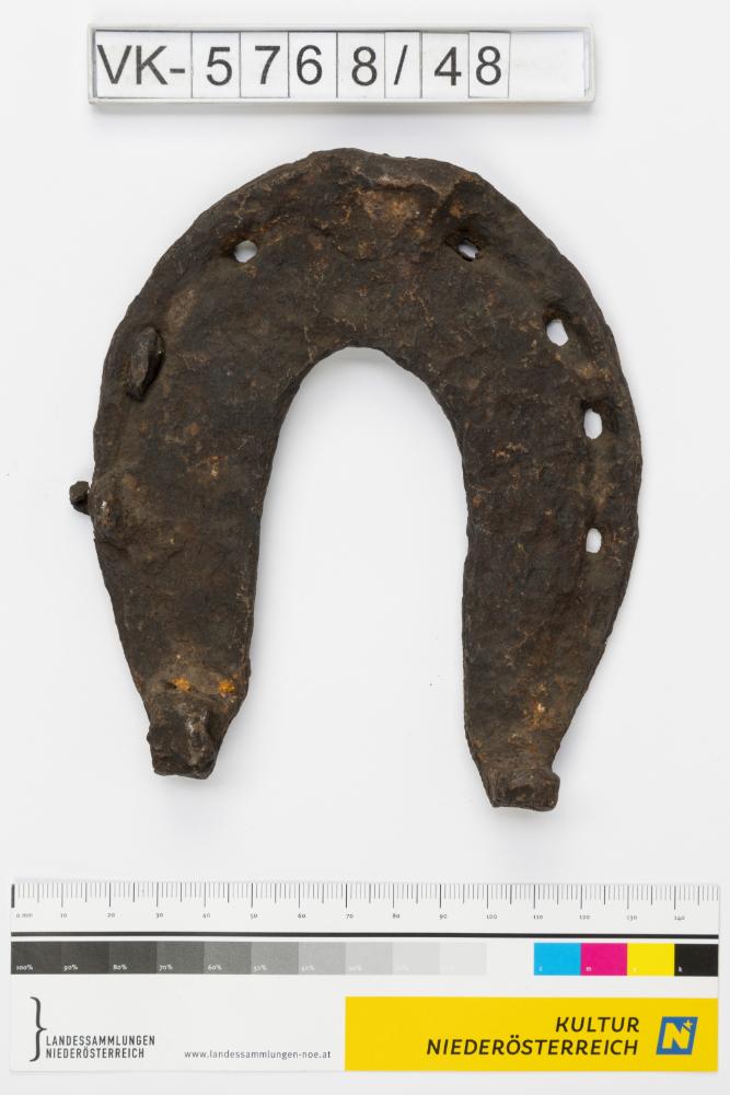Hufeisen mit Löchern für Nägel und einer Zehenkappe, laut Inventarbuch großes Eisen; möglicherweise 12.-13. Jhdt.