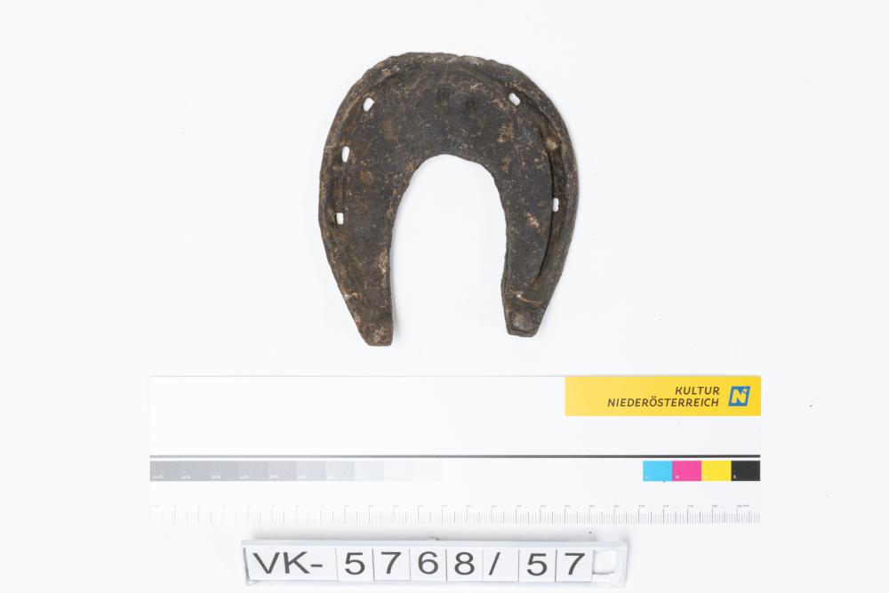 Hufeisen mit Löchern für Nägel. Laut Inventarbuch mit Schmiedezeichen. 1907 gefunden.