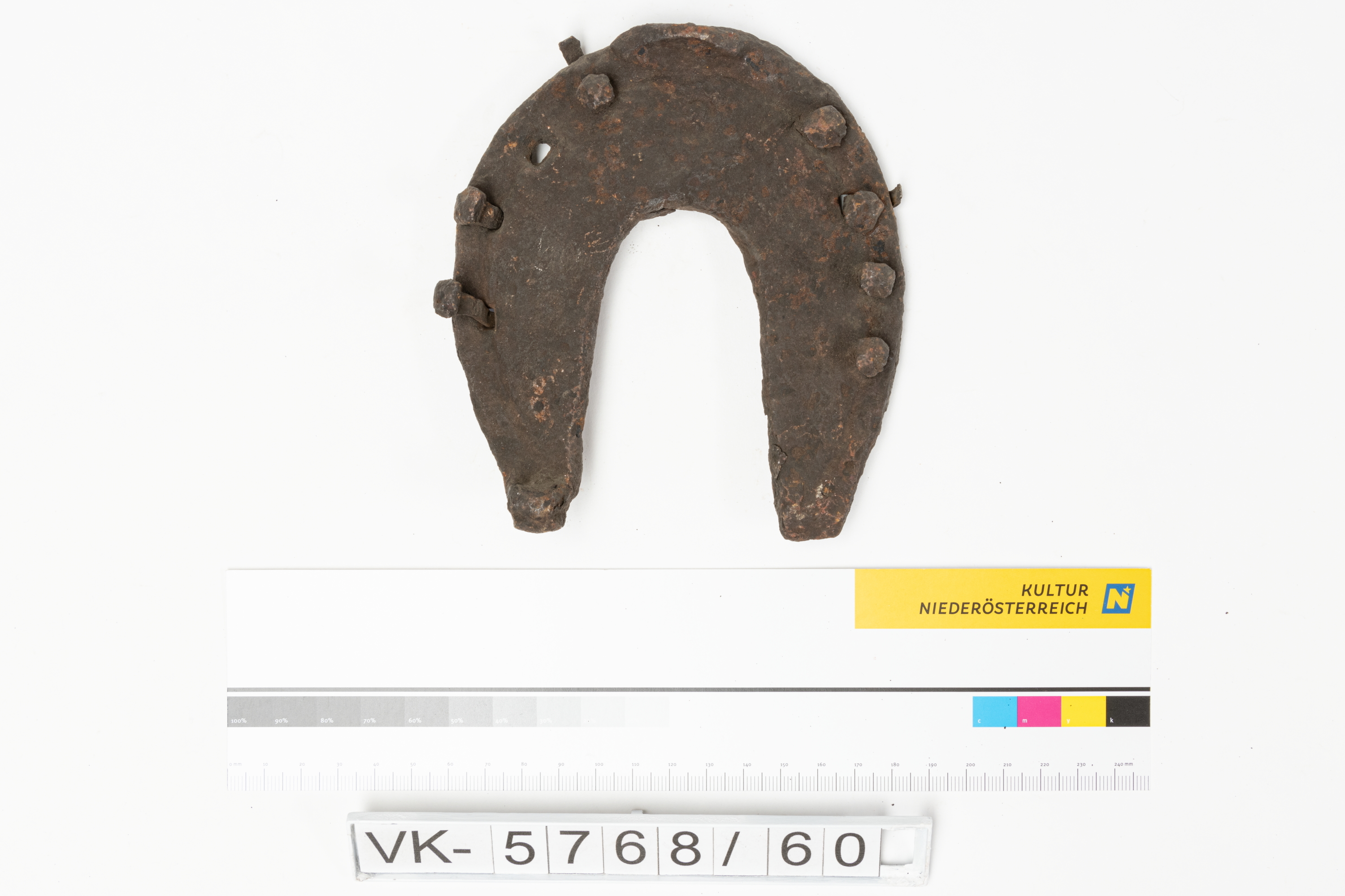 Hufeisen mit Löchern für Nägel. Laut Inventarbuch mit Schmiedezeichen. 1907 gefunden.