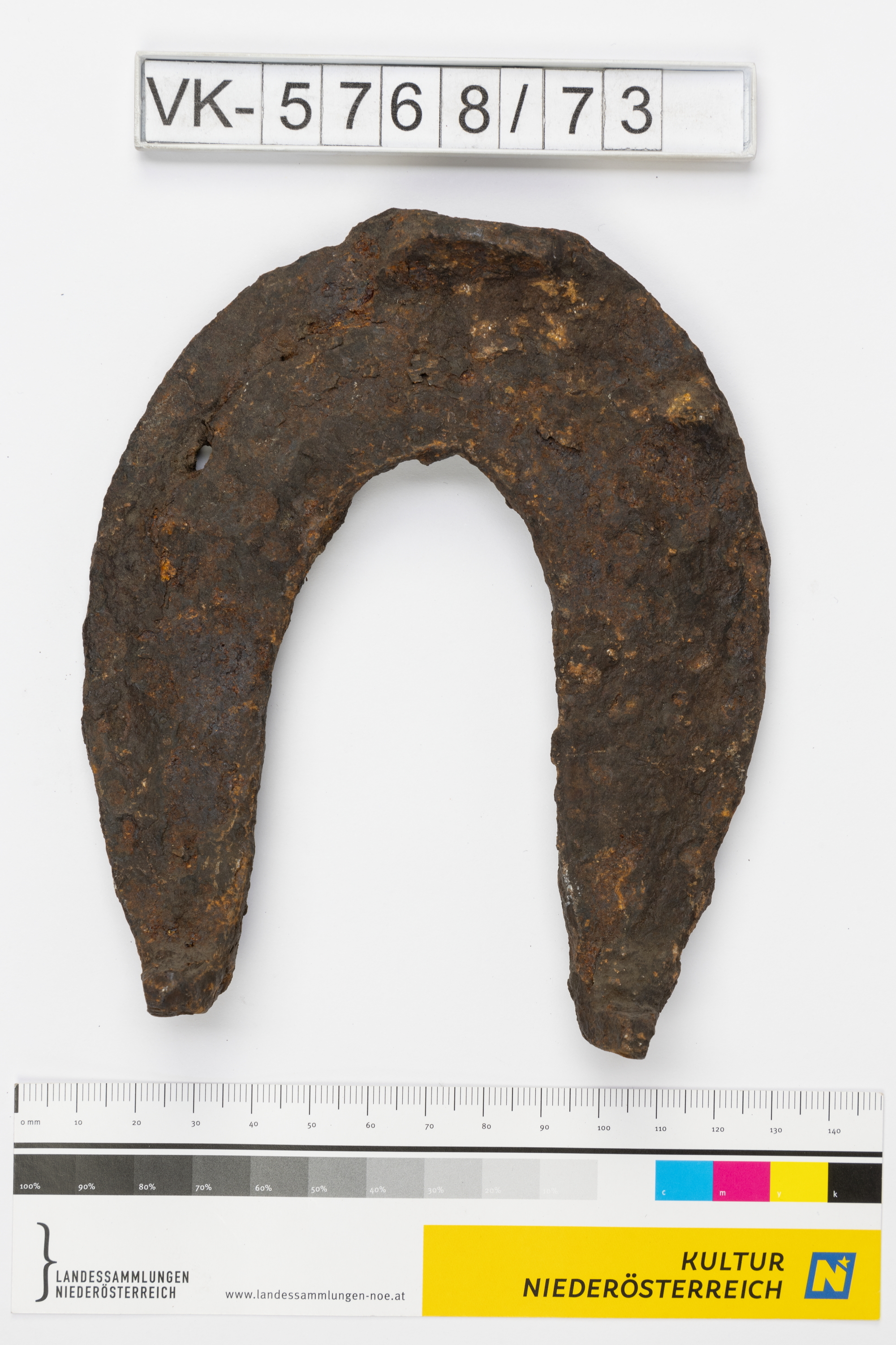Hufeisen mit Löchern für Nägel und einer Zehenkappe, laut Inventarbuch Eisen mittlerer Größe.