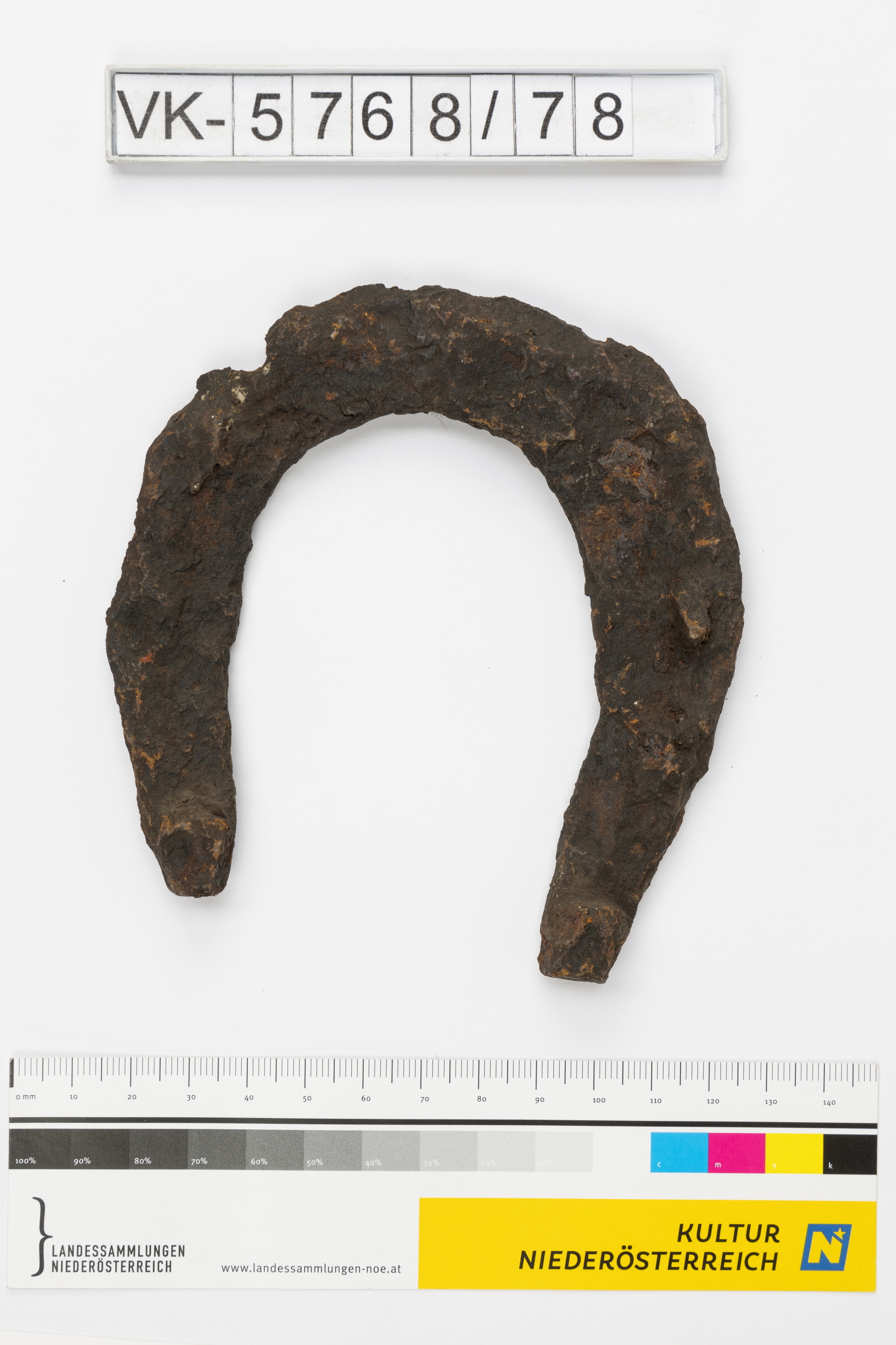 Hufeisen ohne Löcher, laut Inventarbuch Eisen mittlerer Größe, gefunden in der Altstadt von Drosendorf, beim Ausheben der Grundmauer des neuen Hauses gegenüber des Pfarrhofes in 1,5 Metern Tiefe mit Knochenresten. Herkunft fraglich, 1901.