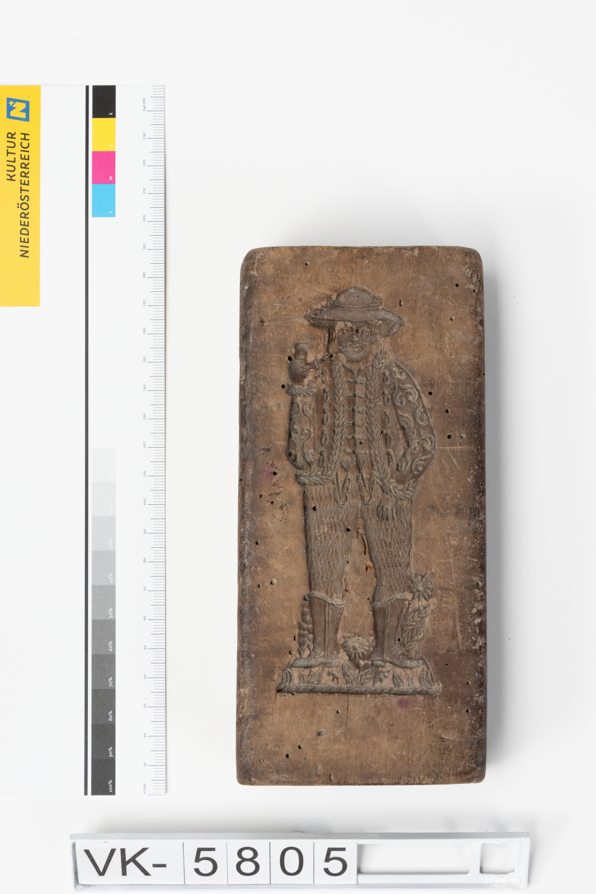 Hölzernes Lebzeltermodel mit eingeschnitzten Motiven auf beiden Seiten: Auf einer Seite ein Mann mit Stiefeln, Pfeife und Hut, auf der anderen Seite Vorder- und Rückseite einer Taschenuhr.