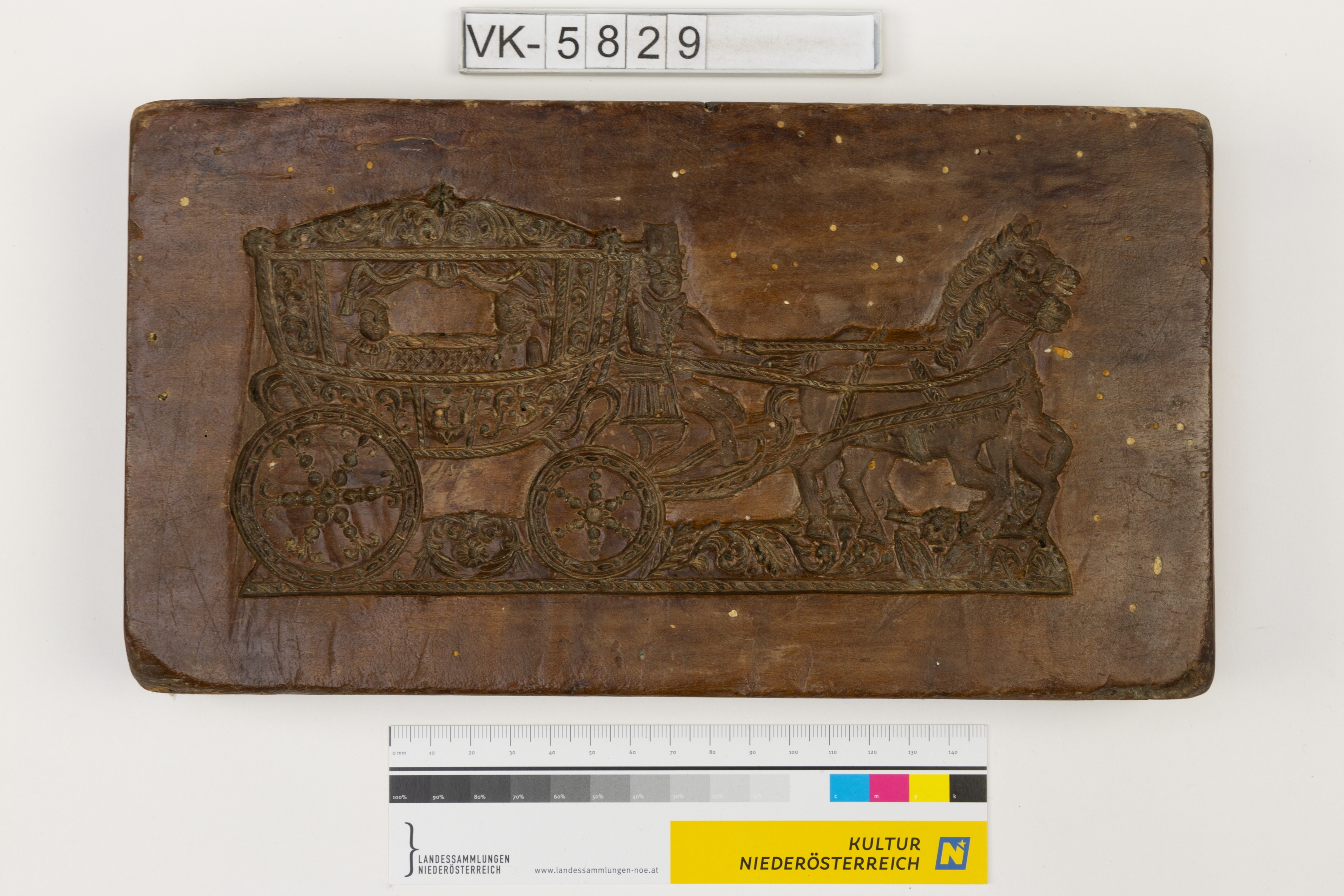 Quaderförmiges Lebzeltermodel mit zwei Negativformen: Elegante Kutsche mit zwei Pferden und Kutscher, Mann in Uniform zu Pferd.