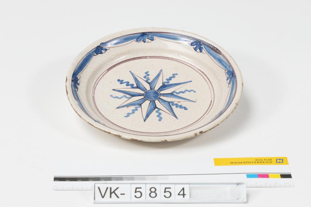 Majolika-Teller: Weiß glasierter Teller mit großem blauem Sterndekor am Boden, am Rand umlaufend blau-dunkelrote Verzierung.