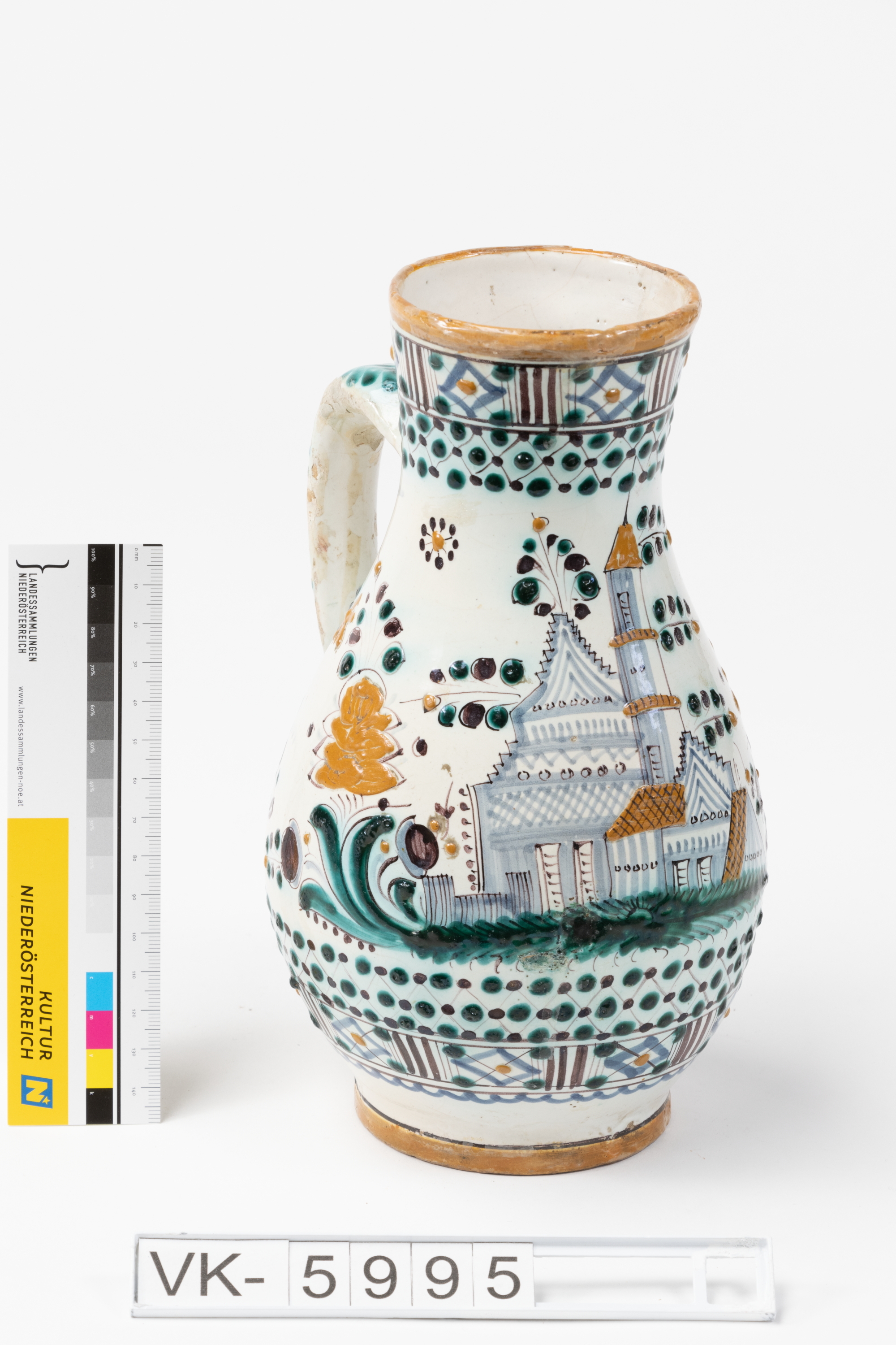 Bauchiger Krug mit schulterständigem Henkel und mehrfärbiger Bemalung: Umlaufende Zierbänder aus geometrischen Mustern und Punkten, verschiedene florale Motive und eine detaillierte Darstellung einer Kirche.